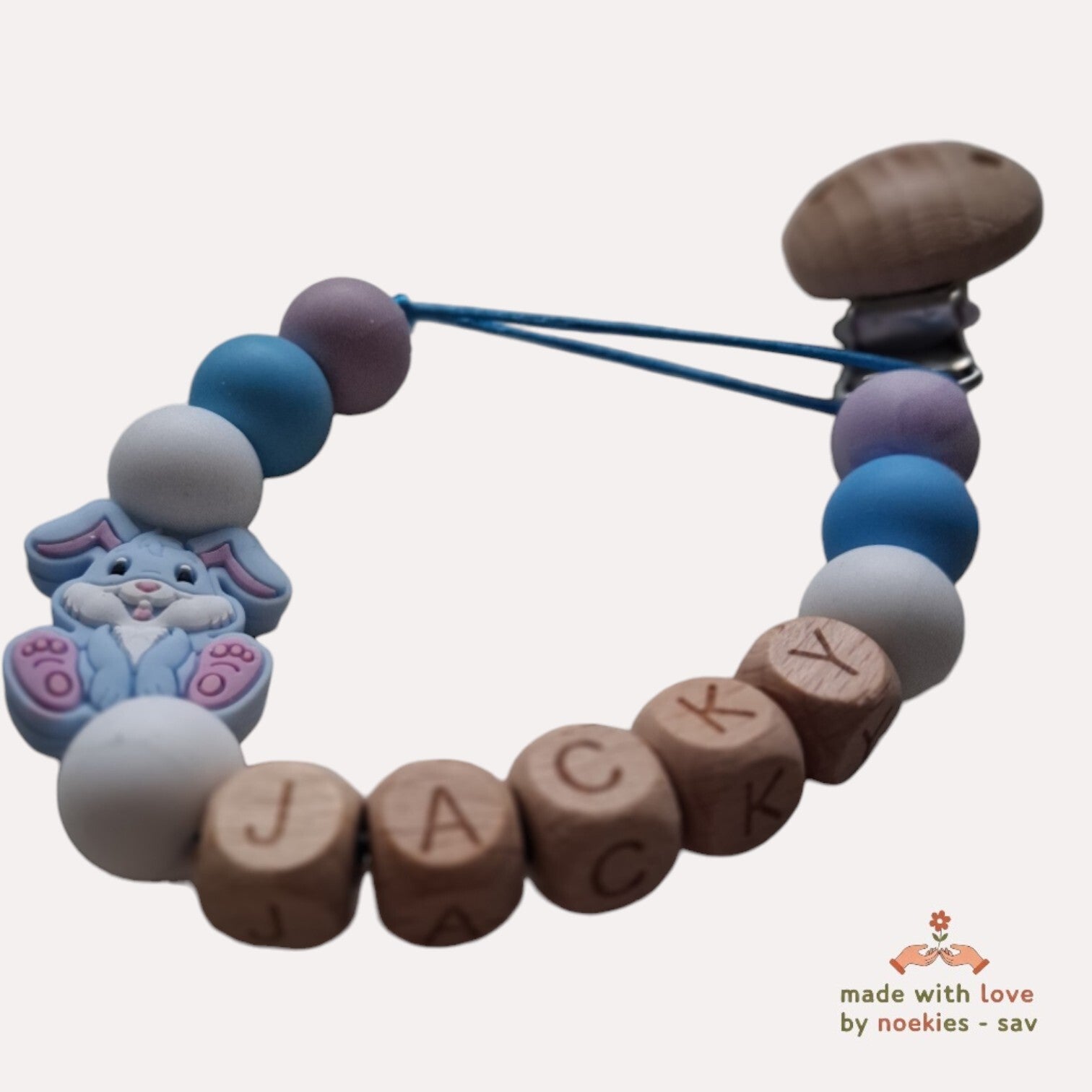 Handgemaakt. Welke naam is voor jou wondertje? Nadat de bestelling voltooid is , ontvangt u een berichtje van mij, welke naam u wenst. En gaan we met liefde aan de slag! De siliconen kralen zijn een mix van blauw, lila en witte kleuren met lichtblauw konijntje. De letterkralen zijn van beukenhout. De kralen zijn volledig BPA-vrij, PVC-vrij, lood-vrij en ftalaat-vrij. Met deze op naam gemaakte speenkoord, raakt je kleintje zijn of haar speentje niet meer kwijt. De handige stevige klip is bedoeld voor aan de kledingstukken die je kind draagt, autostoelgordel, kinderwagen. Voor zowel thuis gebruik als voor onderweg. Erg leuk om cadeau te geven. Niet geschikt als speelgoed of bijtring. Laat je kleintje nooit alleen ermee. Nooit meer het favoriete speentje kwijtraken door zo'n handig speenkoord. Het speentje kan ook niet meer op de grond vallen. Hygiënisch, hip en gepersonaliseerd met naam! Als de naam langer dan 5 letters is (max 9 letters) kan er een aanpassing aan het speenkoord gemaakt worden. Speenkoorden mogen volgends NEN12586 veiligheidnorm, inclusief lus, zonder clip, maximaal 22 cm lang zijn. Noekies .com kan niet aansprakelijk worden gesteld voor enige schade, letsel of ongelukken die voortvloeien uit het gebruik van dit speenkoord, zowel direct als indirect. Een speenkoord Is niet bedoeld om op te bijten. Het gebruik van een speenkoord is op eigen verantwoordelijkheid.