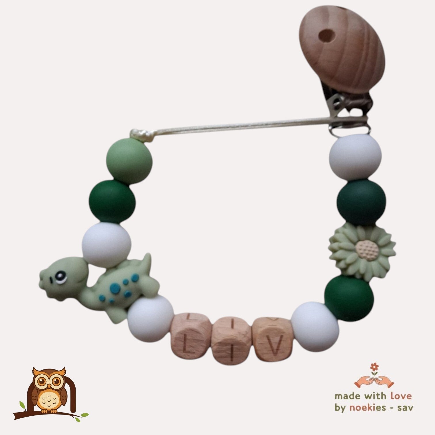 Handgemaakt. Welke naam is voor jou wondertje? De siliconen kralen zijn een mix van khaki, groen en witte kleuren met khaki dino en een khaki bloemetje. De letterkralen zijn van beukenhout. De kralen zijn volledig BPA-vrij, PVC-vrij, lood-vrij en ftalaat-vrij. Met deze op naam gemaakte speenkoord, raakt je kleintje zijn of haar speentje niet meer kwijt. De handige stevige klip is bedoeld voor aan de kledingstukken die je kind draagt, autostoelgordel, kinderwagen. Voor zowel thuis gebruik als voor onderweg. Erg leuk om cadeau te geven. Niet geschikt als speelgoed of bijtring. Laat je kleintje nooit alleen ermee. Nooit meer het favoriete speentje kwijtraken door zo'n handig speenkoord. Het speentje kan ook niet meer op de grond vallen. Hygiënisch, hip en gepersonaliseerd met naam! Als de naam langer dan 5 letters is (max 9 letters) kan er een aanpassing aan het speenkoord gemaakt worden. Speenkoorden mogen volgends NEN12586 veiligheidnorm, inclusief lus, zonder clip, maximaal 22 cm lang zijn. Noekies .com kan niet aansprakelijk worden gesteld voor enige schade, letsel of ongelukken die voortvloeien uit het gebruik van dit speenkoord, zowel direct als indirect. Een speenkoord Is niet bedoeld om op te bijten. Het gebruik van een speenkoord is op eigen verantwoordelijkheid.