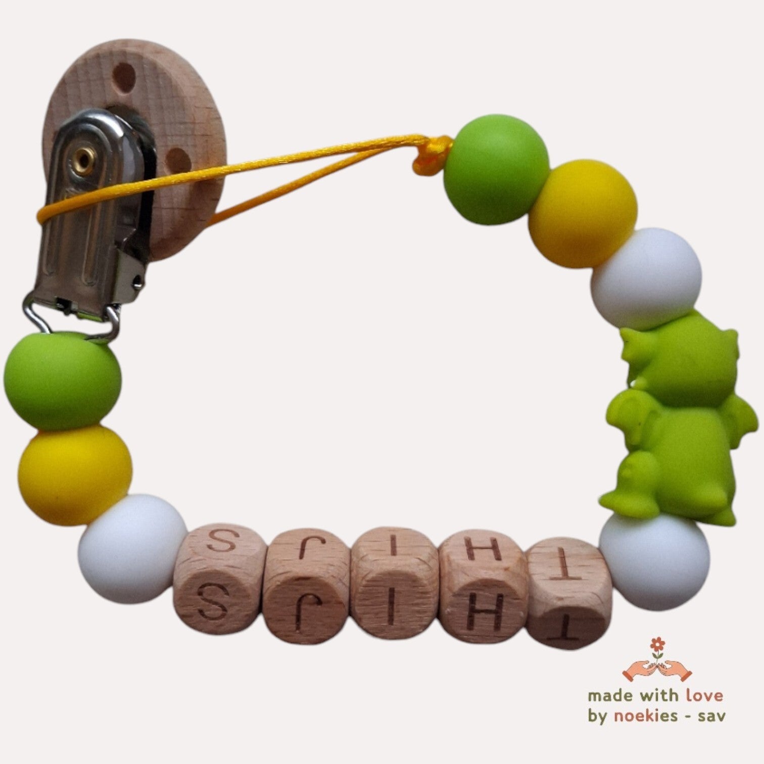 Handgemaakt. Welke naam is voor jou wondertje? Nadat de bestelling voltooid is , ontvangt u een berichtje van mij, welke naam u wenst. En gaan we met liefde aan de slag! De siliconen kralen zijn een mix van appelgroen, geel en witte met appelgroen draakje. De letterkralen zijn van beukenhout. De kralen zijn volledig BPA-vrij, PVC-vrij, lood-vrij en ftalaat-vrij. Met deze op naam gemaakte speenkoord, raakt je kleintje zijn of haar speentje niet meer kwijt. De handige stevige klip is bedoeld voor aan de kledingstukken die je kind draagt, autostoelgordel, kinderwagen. Voor zowel thuis gebruik als voor onderweg. Erg leuk om cadeau te geven. Niet geschikt als speelgoed of bijtring. Laat je kleintje nooit alleen ermee. Nooit meer het favoriete speentje kwijtraken door zo'n handig speenkoord. Het speentje kan ook niet meer op de grond vallen. Hygiënisch, hip en gepersonaliseerd met naam! Als de naam langer dan 5 letters is (max 9 letters) kan er een aanpassing aan het speenkoord gemaakt worden. Speenkoorden mogen volgends NEN12586 veiligheidnorm, inclusief lus, zonder clip, maximaal 22 cm lang zijn. Noekies .com kan niet aansprakelijk worden gesteld voor enige schade, letsel of ongelukken die voortvloeien uit het gebruik van dit speenkoord, zowel direct als indirect. Een speenkoord Is niet bedoeld om op te bijten. Het gebruik van een speenkoord is op eigen verantwoordelijkheid.