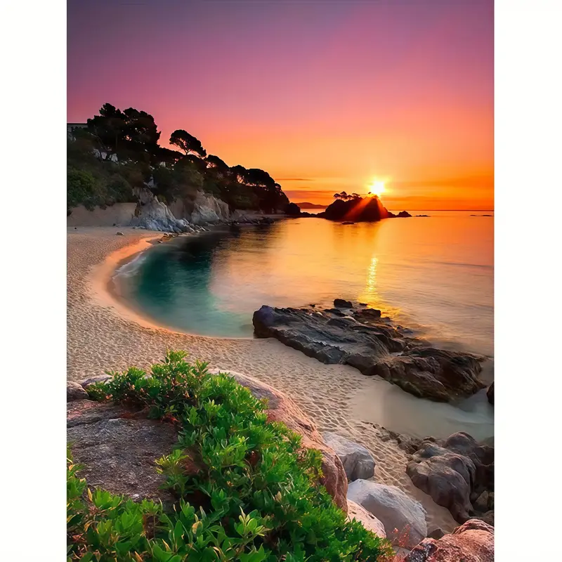 Mooie diamond painting. Thema landschap. Mooie zonsondergang aan het strand. Ontdek de wereld van diamond painting met dit complete DIY pakket. Met de canvas en bijgeleverde steentjes maak je stap voor stap een schitterend schilderij dat sprankelt door de diamantjes. Een ontspannende en creatieve hobby die zorgt voor uren plezier en een prachtig eindresultaat. De gedetailleerde prints zorgen ervoor dat jouw kunstwerk er levendig en kleurrijk uitziet. Perfect voor iedereen die houdt van creativiteit, ontspanning en het maken van een uniek kunstwerk. Complete diamond painting set,Inclusief canvas, steentjes en accessoires.Creëer je eigen sprankelend schilderij. Stimuleert creativiteit en ontspanning. Ideaal als hobby of cadeau.
