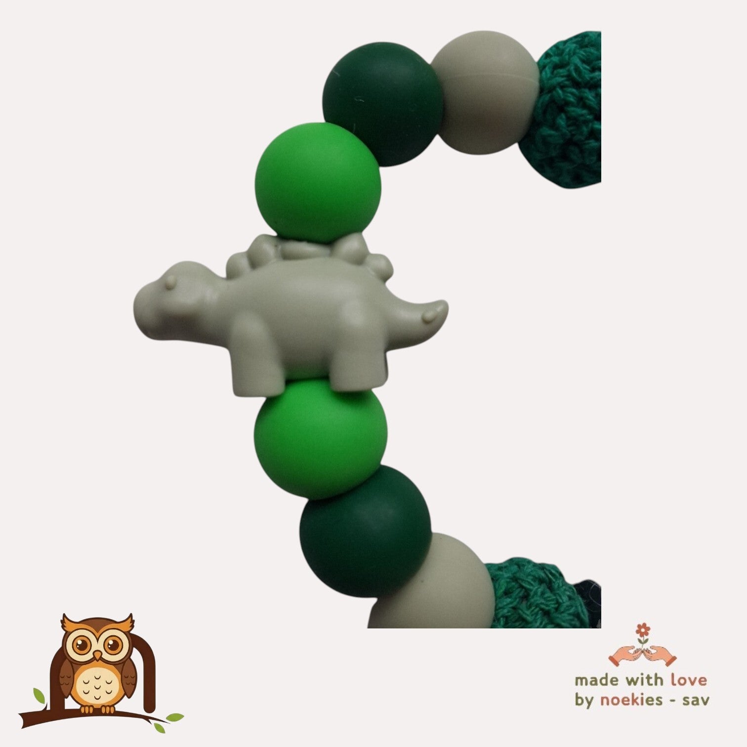 Handgemaakt. Thema Dino. Speenkoord met stekel dino in de kleuren khaki groen, donekrgroen. Met deze speenkoord, raakt je kleintje zijn of haar speentje niet meer kwijt. De handige stevige klip is bedoeld voor aan de kledingstukken die je kind draagt, autostoelgordel, kinderwagen. Voor zowel thuis gebruik als voor onderweg. Totale lengte 28cm. Erg leuk om cadeau te geven. Niet geschikt als speelgoed of bijtring. Laat je kleintje nooit alleen ermee. Het speentje kan ook niet meer op de grond vallen. Noekies .com kan niet aansprakelijk worden gesteld voor enige schade, letsel of ongelukken die voortvloeien uit het gebruik van dit speenkoord, zowel direct als indirect. Een speenkoord Is niet bedoeld om op te bijten. Het gebruik van een speenkoord is op eigen verantwoordelijkheid.