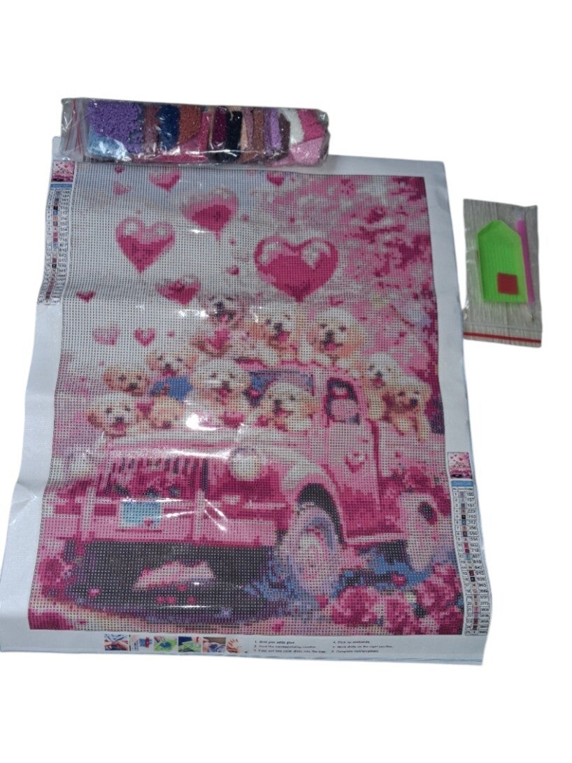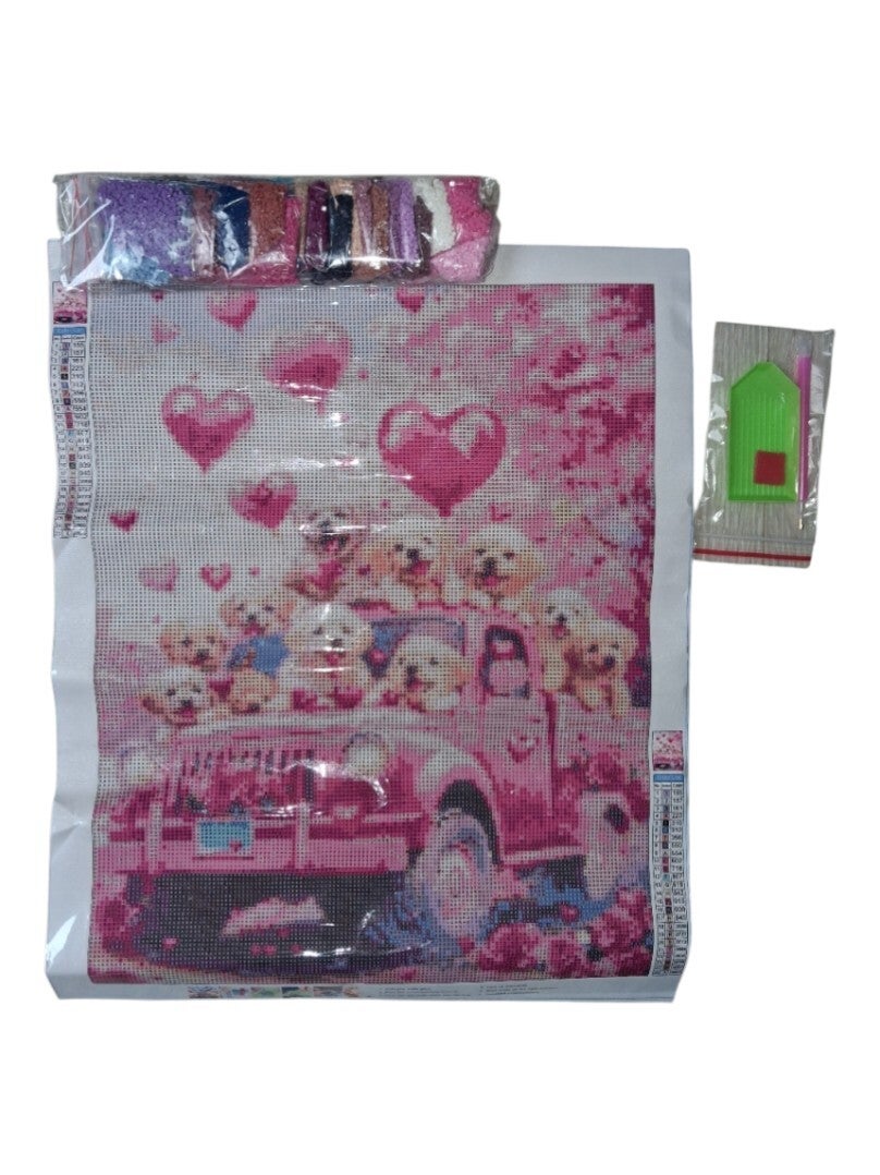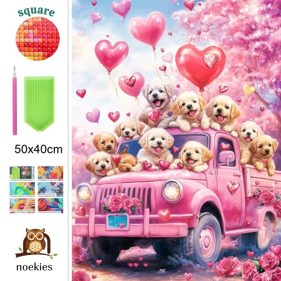 nr 2 Diamond Painting puppy's op roze auto 50x40cm (vierkant)