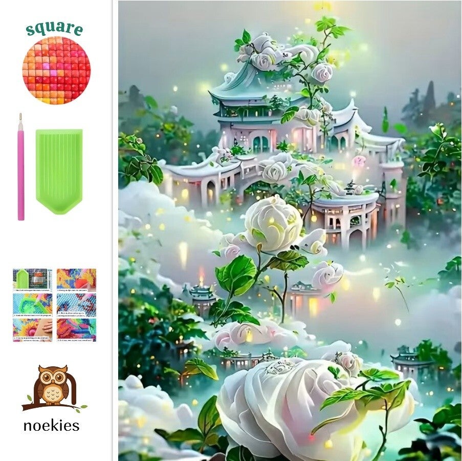 Diamond painting pakket met een afbeelding van witte rozen en een sprookjesachtig kasteel. De set bevat een canvas, vierkante diamantjes, een "ticky pen", een dienblad en lijm. De diamantjes zijn vierkant en er is 30% meer dan nodig inbegrepen. Mooie Diamond Painting groen paleis. Deze Diamond Painting is 40x30cm. Painting vlak is 35x25cm. Vierkante diamantjes. Waarom kiezen voor Diamond Painting? Eenvoudig & Leuk: Geen ervaring nodig, gewoon de steentjes op de juiste plek plaatsen. Stressverlagend: Een ontspannende hobby die helpt om te focussen en tot rust te komen. Gedetailleerde Afbeeldingen: Levendige kleuren en sprankelende diamanten zorgen voor een verbluffend eindresultaat. Compleet Pakket: Inclusief canvas met plaklaag, steentjes, pen en wax – alles wat je nodig hebt om direct te beginnen. Zowel volwassenen als kinderen kunnen genieten van deze noekies .com Diamond Painting sets. Een leuke activiteit voor het hele gezin! Het canvas is van hoogwaardige kwaliteit en zorgt ervoor dat je kunstwerk lang mooi blijft. Met Diamond Painting van noekies .com kun je eindeloos creatief bezig zijn en jouw eigen kunstwerk maken. Snelle verzending Wil je snel aan jou nieuwe kunstwerk van noekies .com beginnen. We verzenden elke werkdag, Zodat je vaak de volgende dag of binnen 2 werkdagen kan beginnen. Heb je vragen? Stuur een berichtje!
