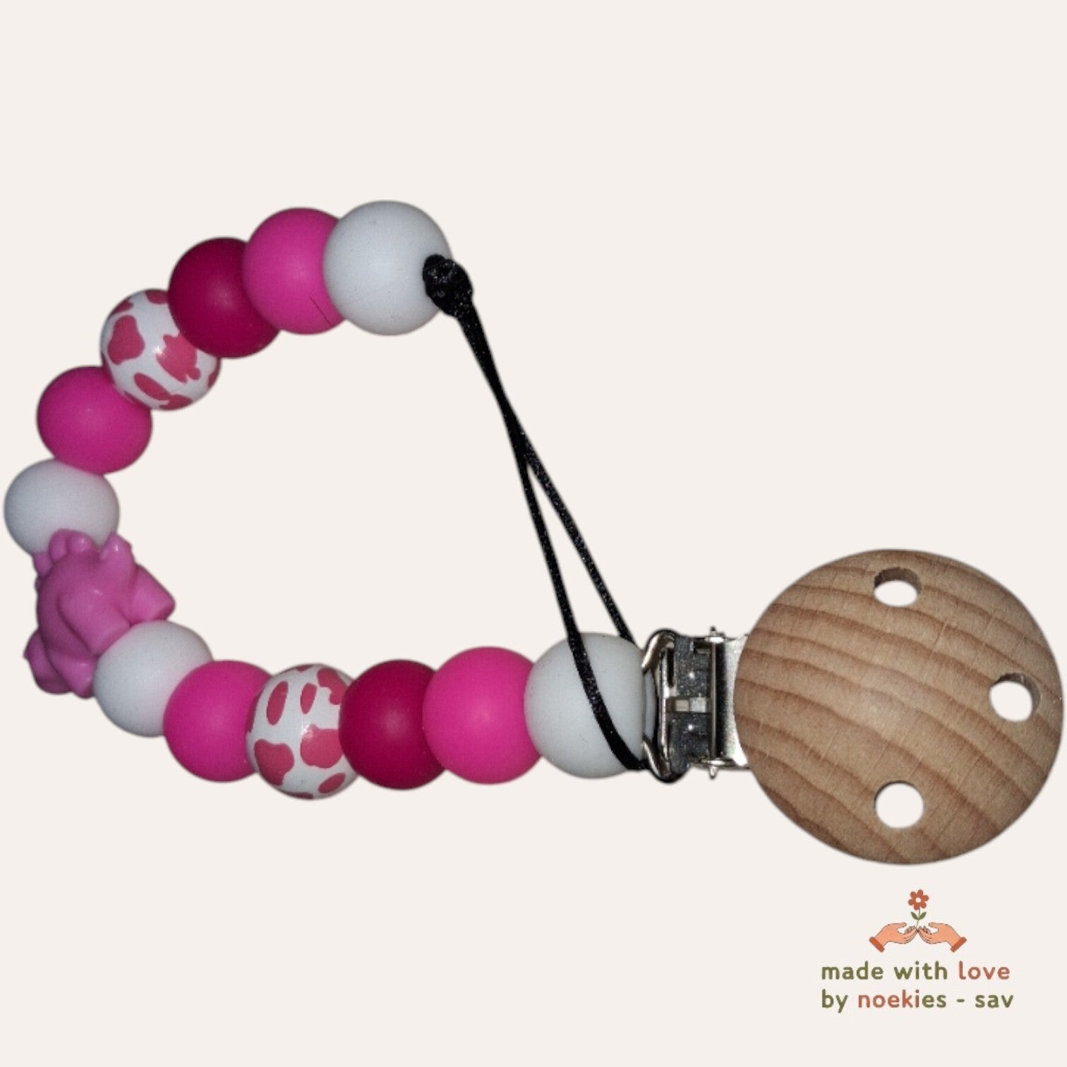 Thema Dino. Speenkoord met dino in de kleuren roze wit. En 2 houten panterprint kralen. Met deze speenkoord, raakt je kleintje zijn of haar speentje niet meer kwijt. De handige stevige klip is bedoeld voor aan de kledingstukken die je kind draagt, autostoelgordel, kinderwagen. Voor zowel thuis gebruik als voor onderweg. Totale lengte 28cm. Erg leuk om cadeau te geven. Niet geschikt als speelgoed of bijtring. Laat je kleintje nooit alleen ermee. Het speentje kan ook niet meer op de grond vallen. Speenkoorden mogen volgends NEN12586 veiligheidnorm, inclusief lus, zonder clip, maximaal 22 cm lang zijn. - Noekies .com kan niet aansprakelijk worden gesteld voor enige schade, letsel of ongelukken die voortvloeien uit het gebruik van dit speenkoord, zowel direct als indirect. Een speenkoord Is niet bedoeld om op te bijten. Het gebruik van een speenkoord is op eigen verantwoordelijkheid.
