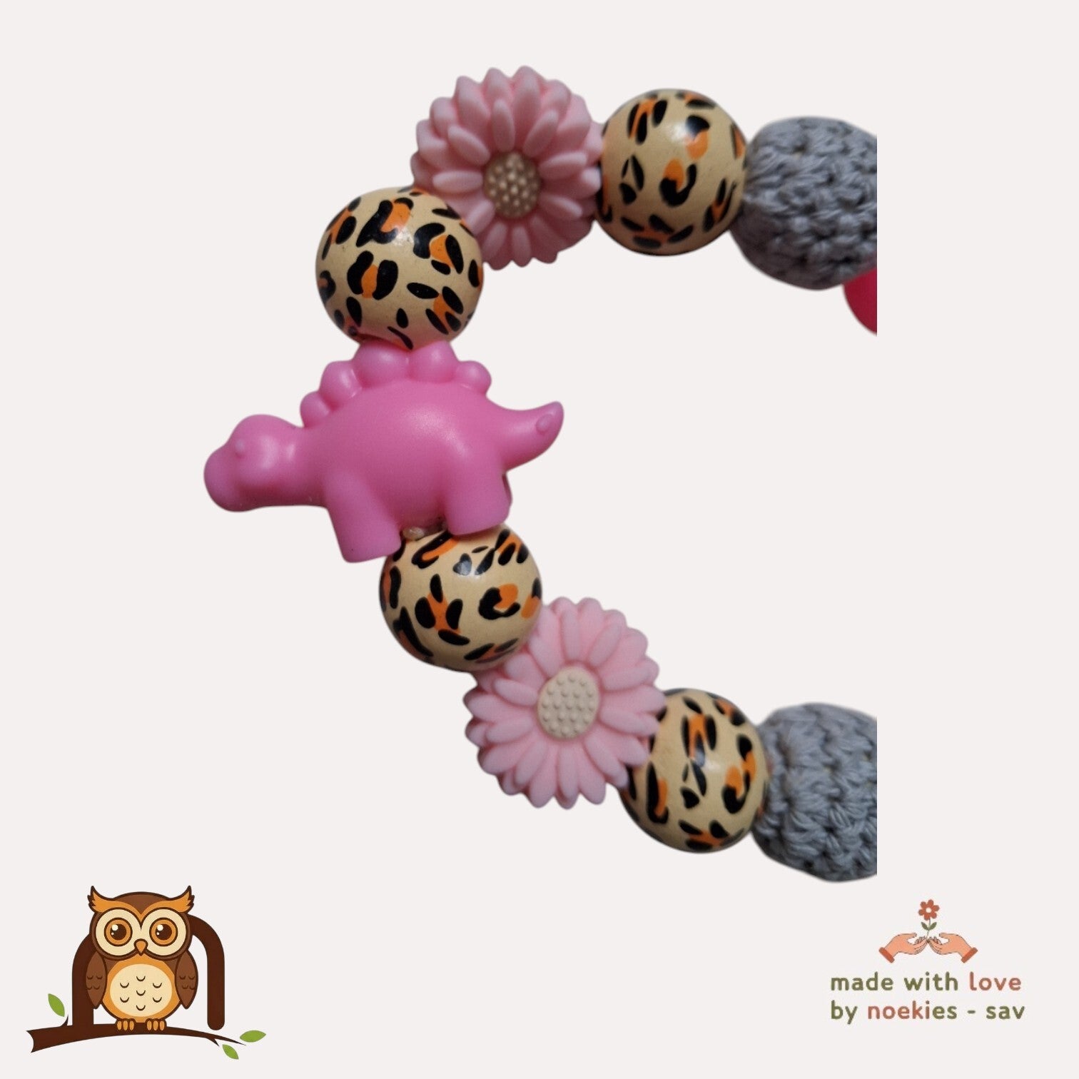 Thema Dino. Speenkoord met roze dino, houten panterprint kralen, 2 schattige bloemetjes en 2 woliige kralen. Met deze speenkoord, raakt je kleintje zijn of haar speentje niet meer kwijt. De handige stevige klip is bedoeld voor aan de kledingstukken die je kind draagt, autostoelgordel, kinderwagen. Voor zowel thuis gebruik als voor onderweg. Totale lengte 28cm. Erg leuk om cadeau te geven. Niet geschikt als speelgoed of bijtring. Laat je kleintje nooit alleen ermee. Het speentje kan ook niet meer op de grond vallen. Speenkoorden mogen volgends NEN12586 veiligheidnorm, inclusief lus, zonder clip, maximaal 22 cm lang zijn. - Noekies .com kan niet aansprakelijk worden gesteld voor enige schade, letsel of ongelukken die voortvloeien uit het gebruik van dit speenkoord, zowel direct als indirect. Een speenkoord Is niet bedoeld om op te bijten. Het gebruik van een speenkoord is op eigen verantwoordelijkheid.