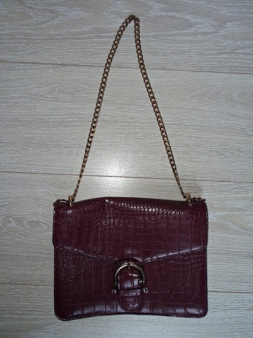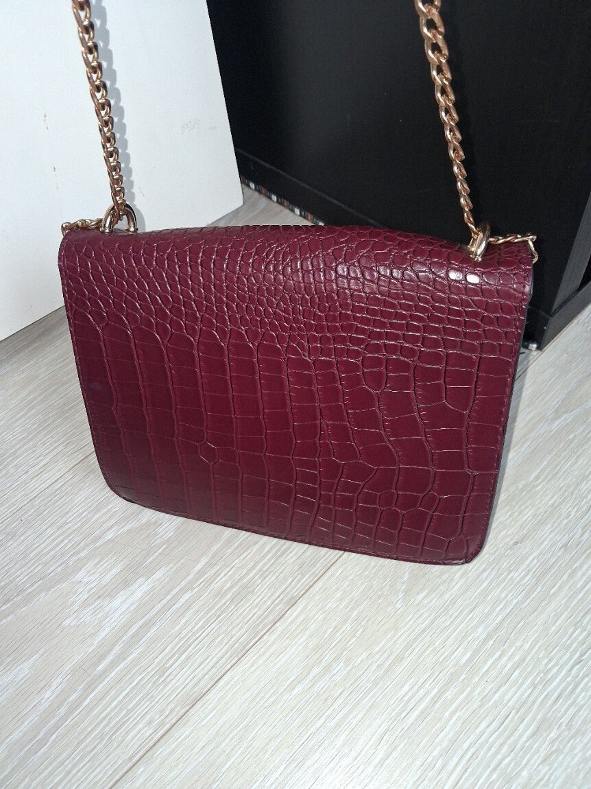 Mooie nette schoudertas met krododillen leer look, in sjieke kleur wijnrood, met goudkleurige schouderketting. De voorkant heeft een magneet sluiting. Aan de binnenkant vind je 2 vakken en aan de zijkant 1 apart open vakje. De tas heeft de afmetingen 25cm x 19cm. Heeft alleen lichte beschadiging zie foto binnenin de tas op de zwarte randjes.