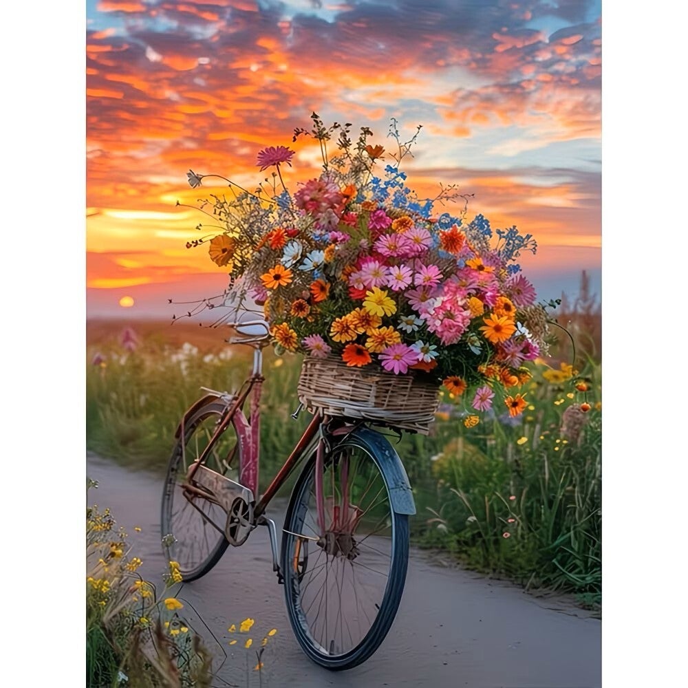 Diamond painting fiets met pluk bloemen 40x30cm (rond)