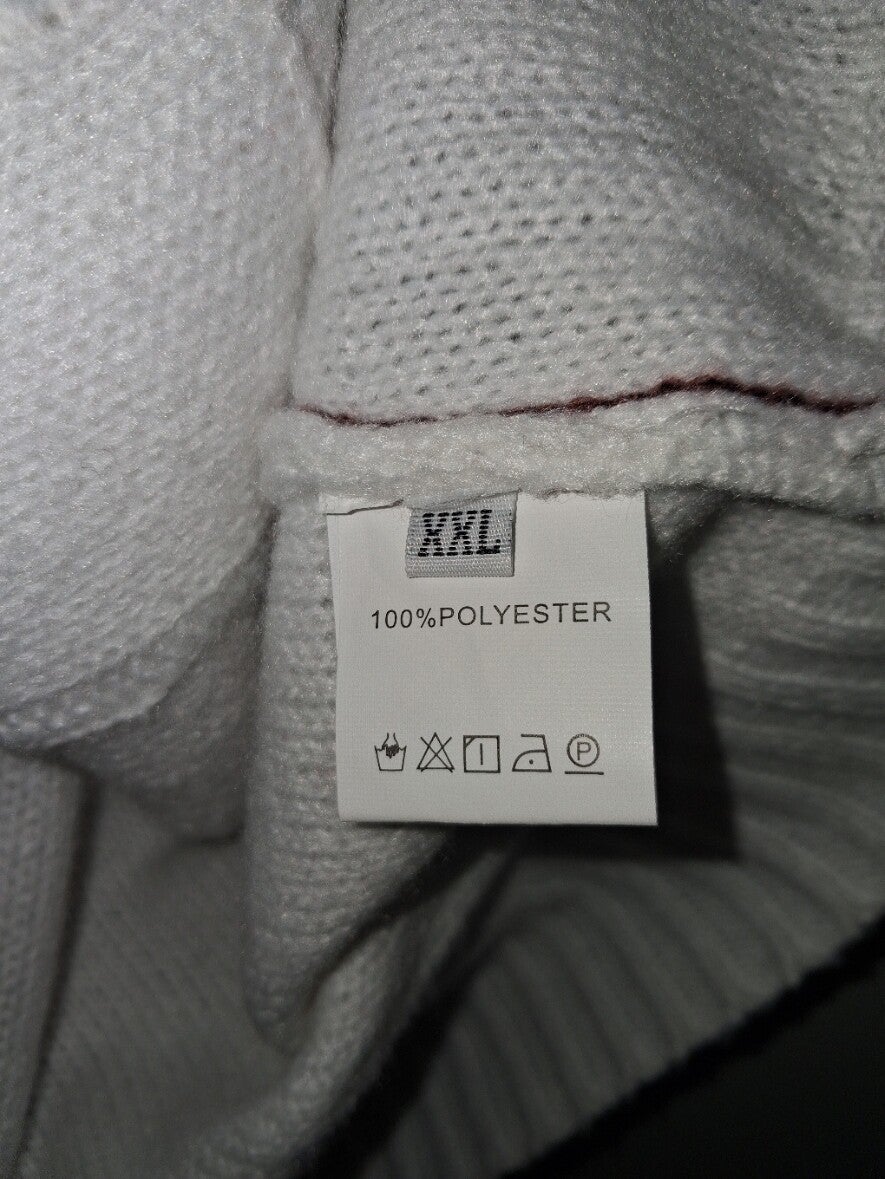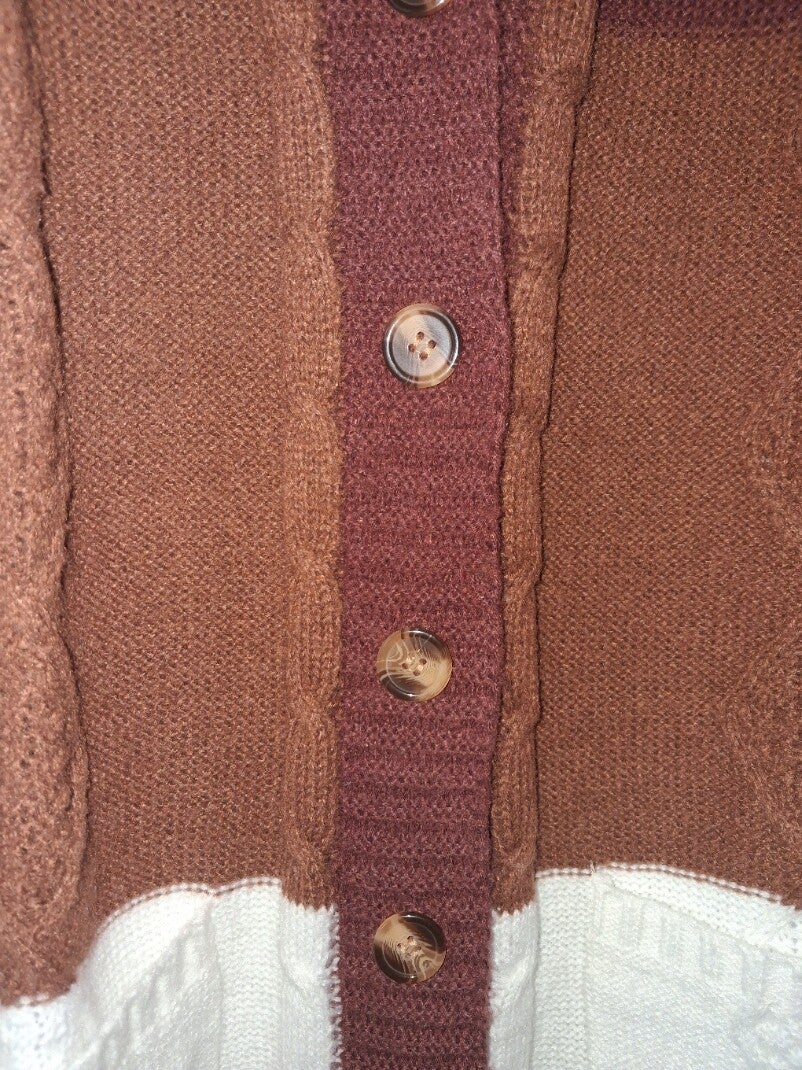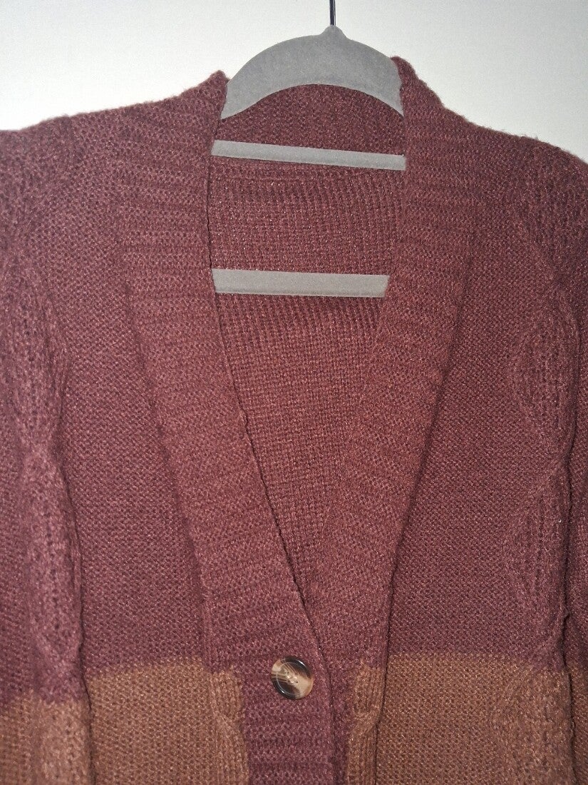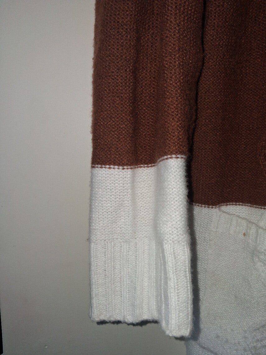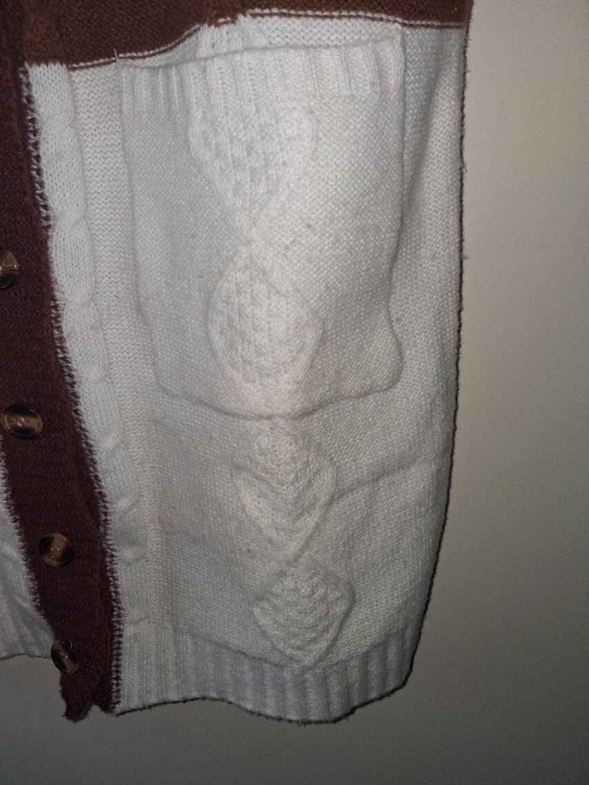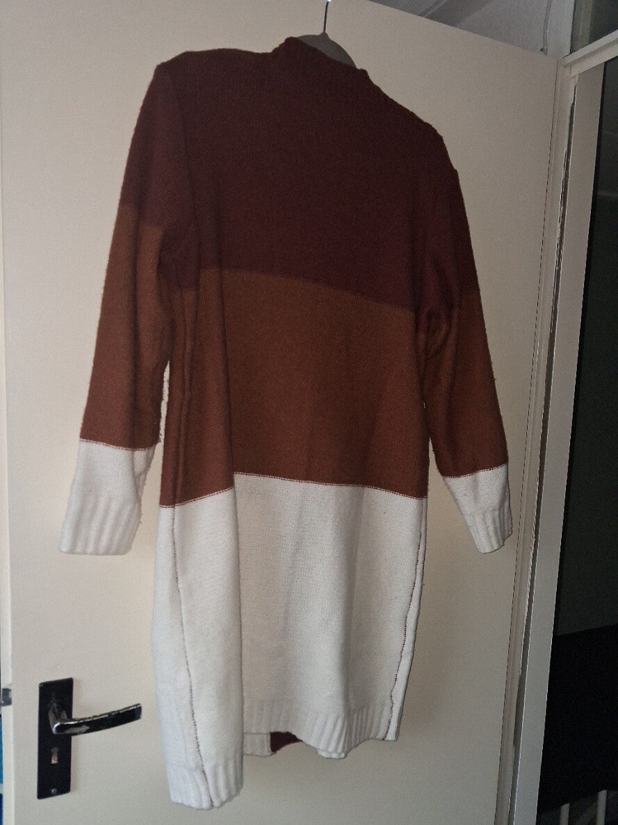 Weinig gedragen, warm en lang vest in de kleuren bruin en wit met aan de voorkant mooi kabel patroon erin. Dit vest heeft een vhals en knoops sluiting. En kan zowel dicht als open gedragen worden. Maat XXL. lengte 90cm.