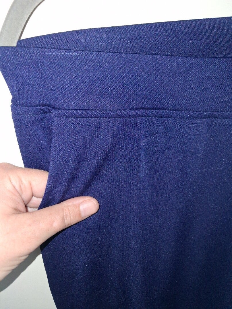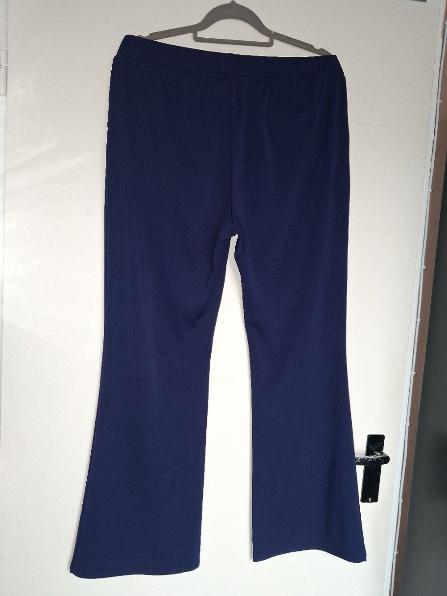Weinig gedragen, Stretchy lange broek met beetje uitlopend effect. Deze broek heeft aan de voorkant insteekzakken. Kleur marineblauw. Maat 2XL. taille 87-93cm. heupen 112-118cm. lengte 104cm. binnenbeenlengte 75cm.