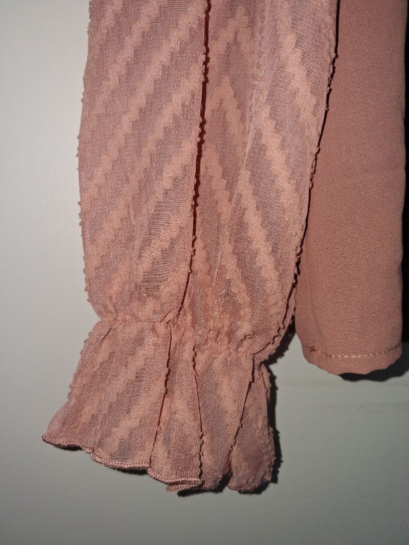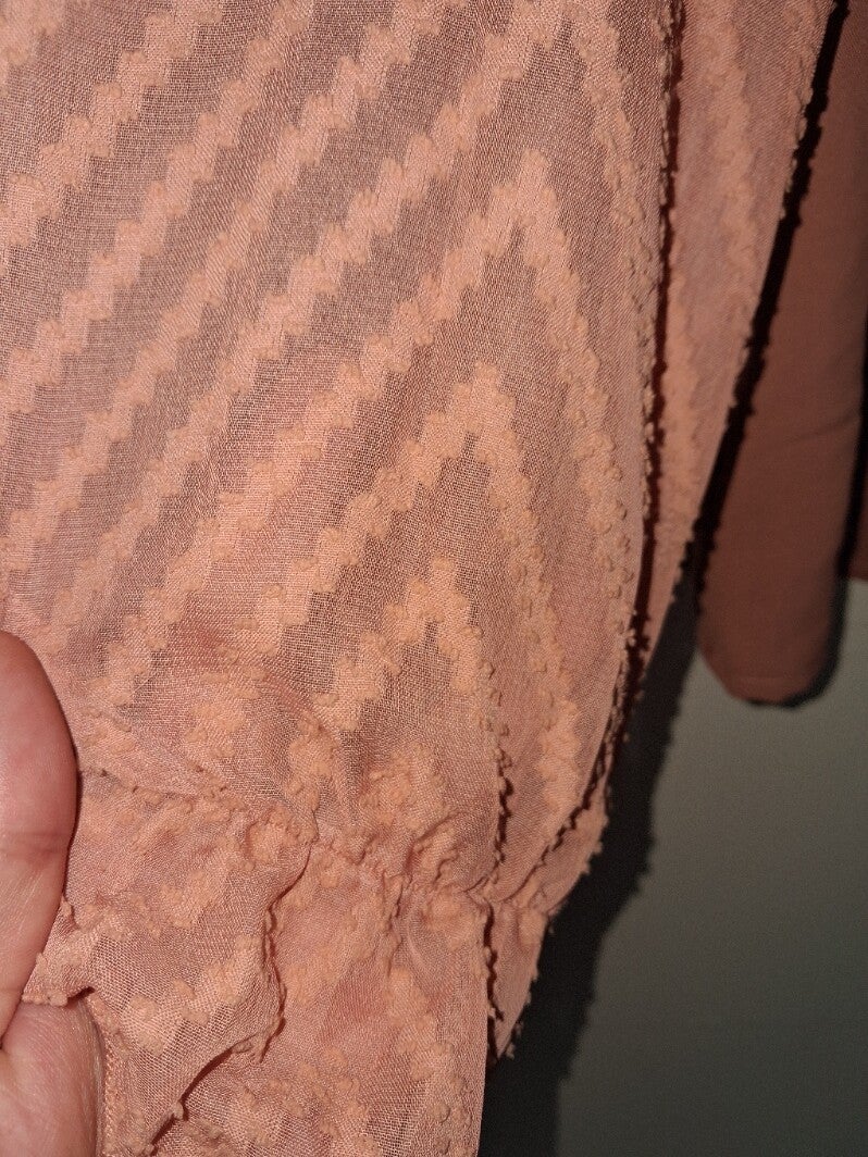Weinig gedragen. Tuniek in aparte pastel roze oranje kleur met doorschijn mouwen. Maat XL oksel 58cm lengte 62cm.