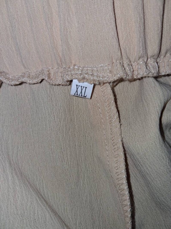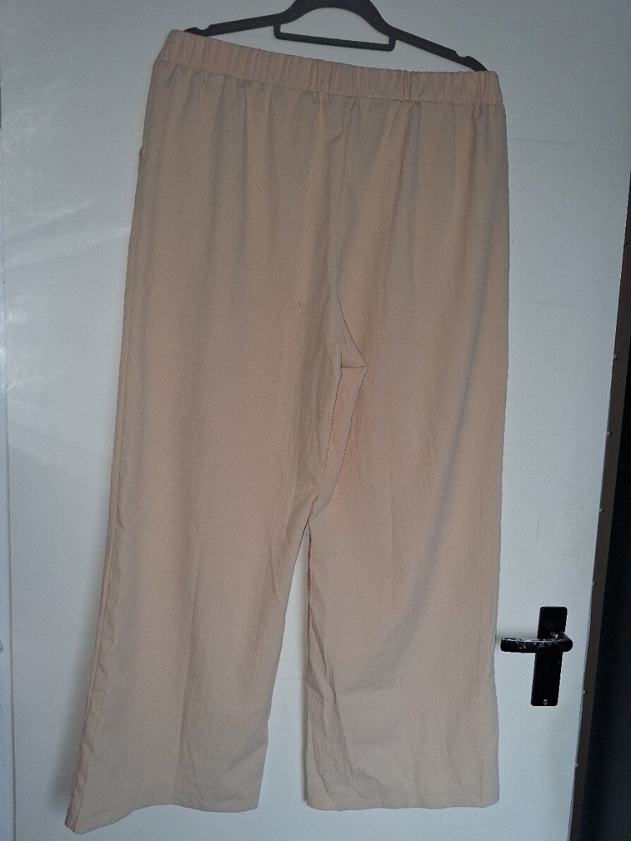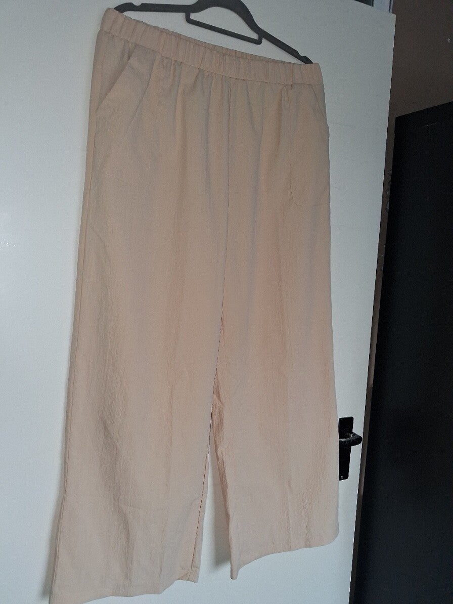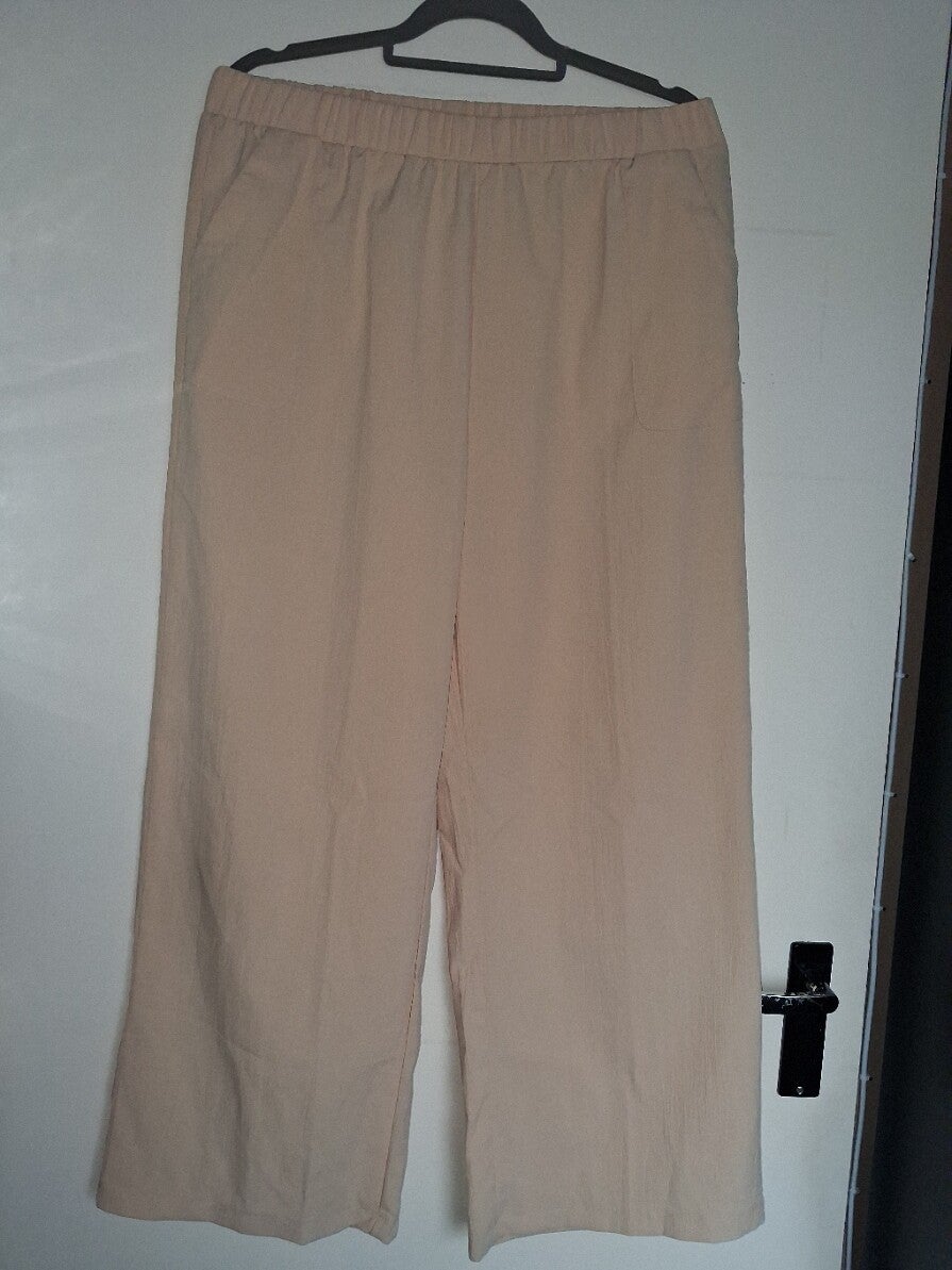 Weinig gedragen wijde broek met elastische taille. Kleur creme. Met insteek zakken aan de voorkant. Maat XXL. Taille 87-93cm heupen 112-118cm lengte 102cm. binnenbeen 72 cm. Heeft wel 1 klein vlekje aan de achterkant zie foto. Verder zo goed als nieuw.