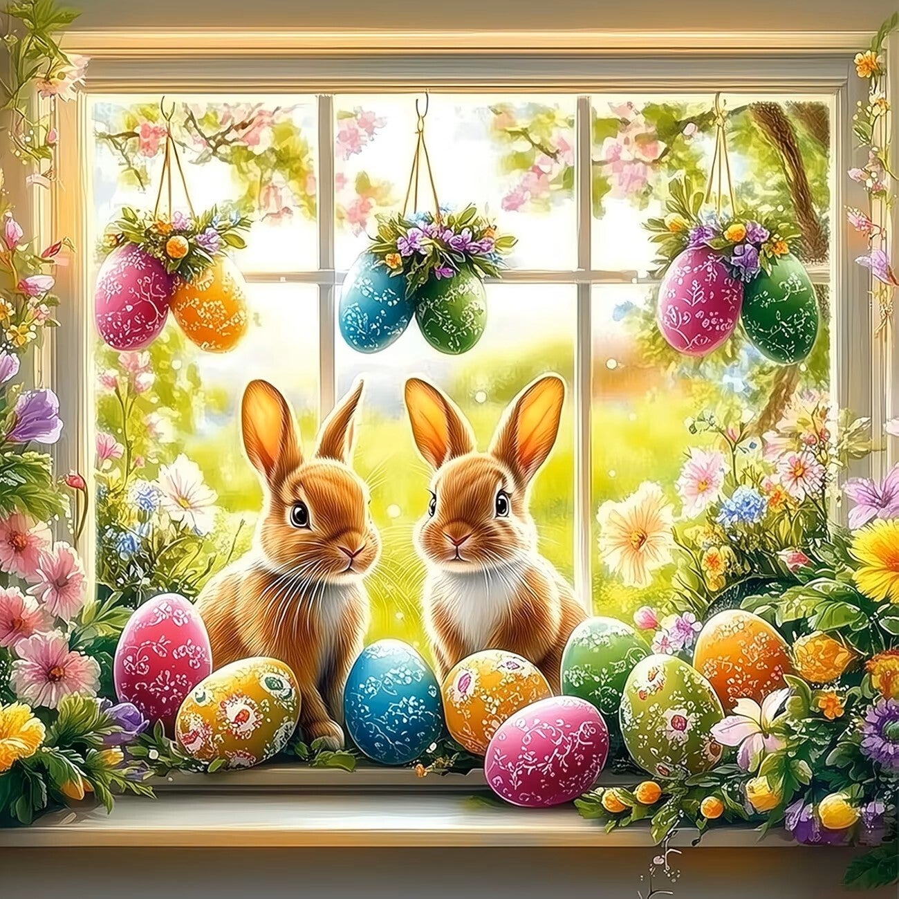 nr 604 Diamond painting paashazen met eieren 40x40cm (rond)