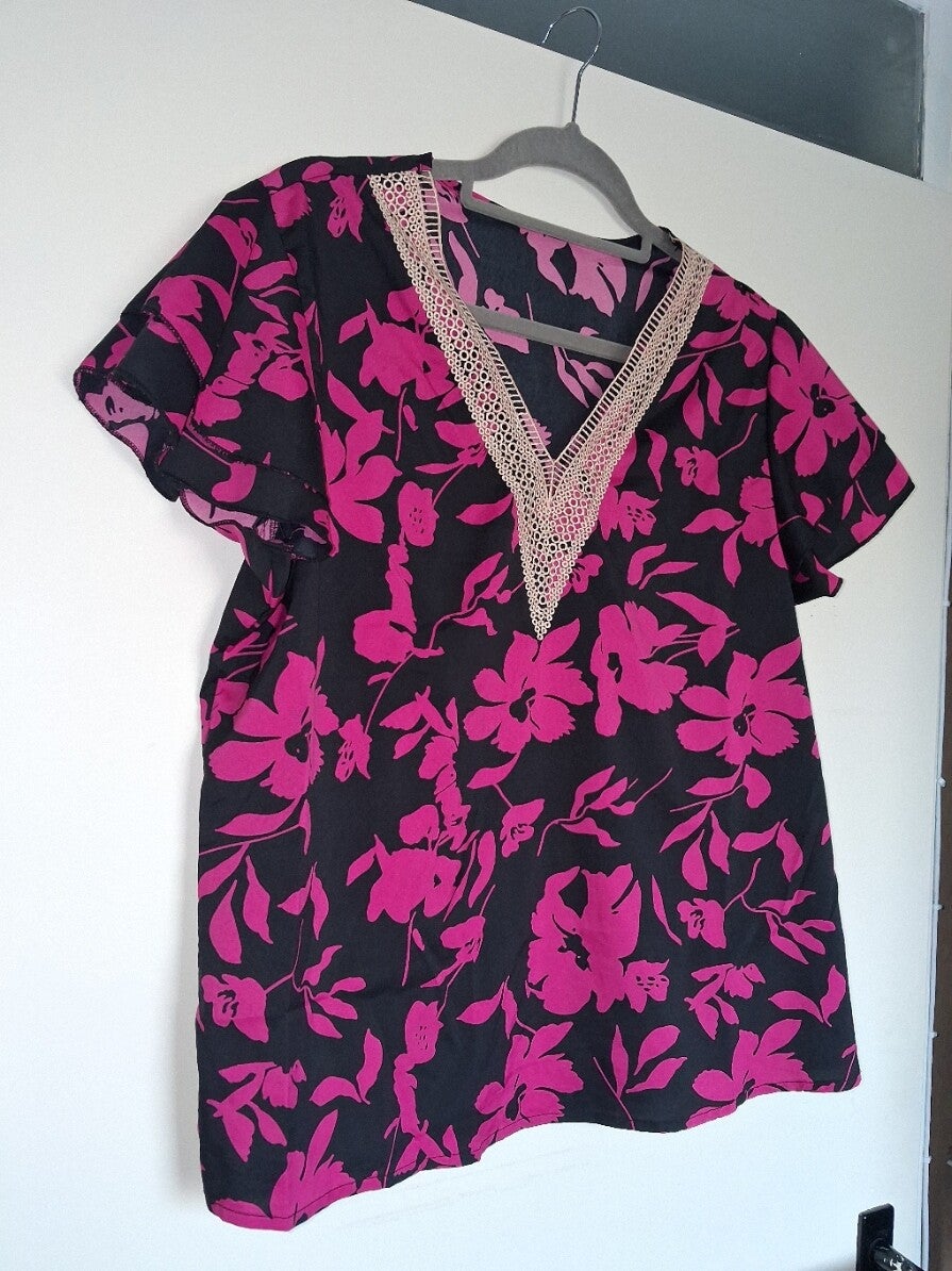 Zo goed als nieuw. Deze top heeft een opvallend bloemenpatroon in fuchsia op een zwarte achtergrond. De V-hals is versierd met een gioudkleurig kanten detail, wat een elegant accent toevoegt. De korte mouwen zijn licht geplooid, wat zorgt voor een speelse en comfortabele pasvorm. De top is recht gesneden en valt soepel, ideaal voor diverse gelegenheden. Maat XL
