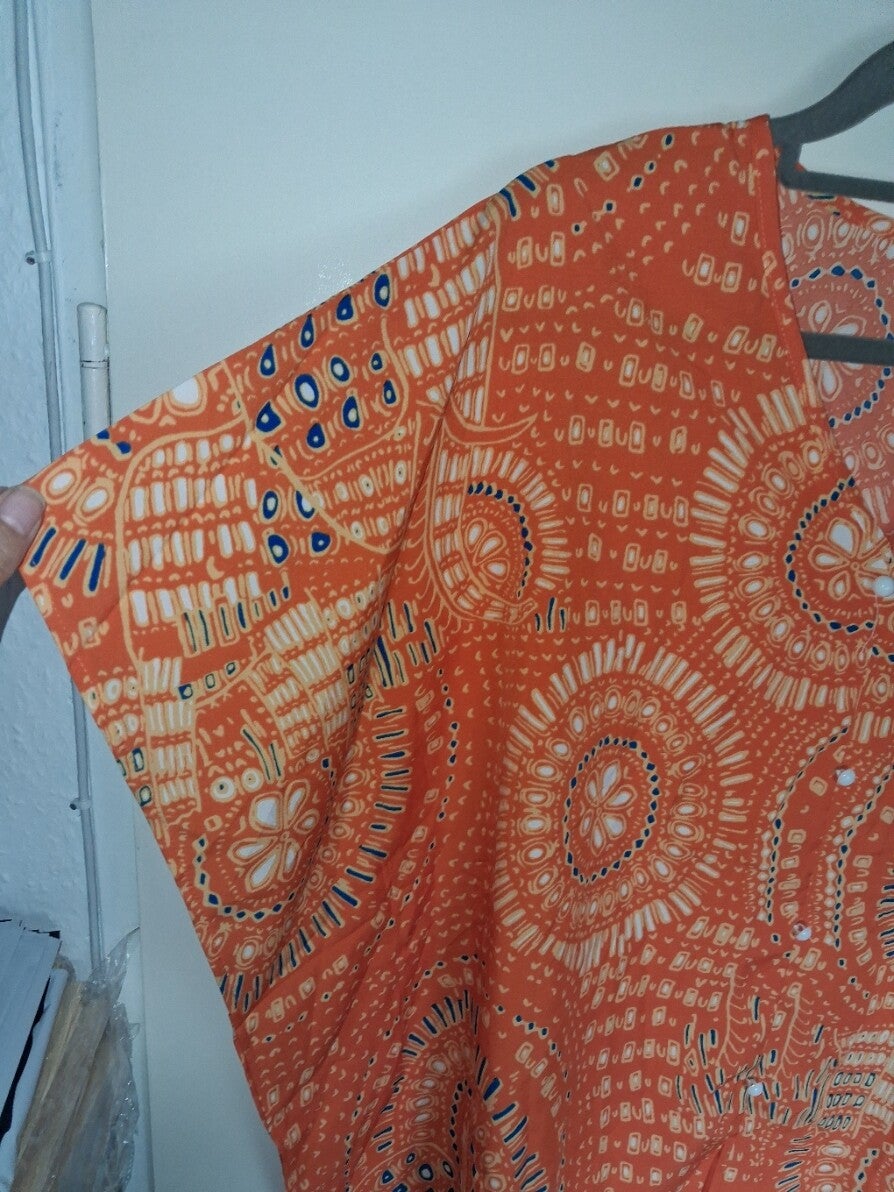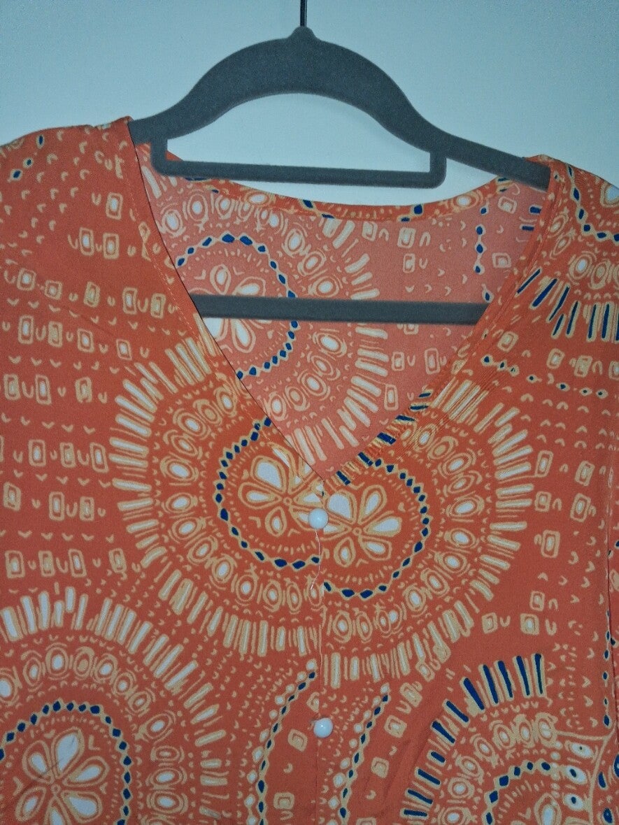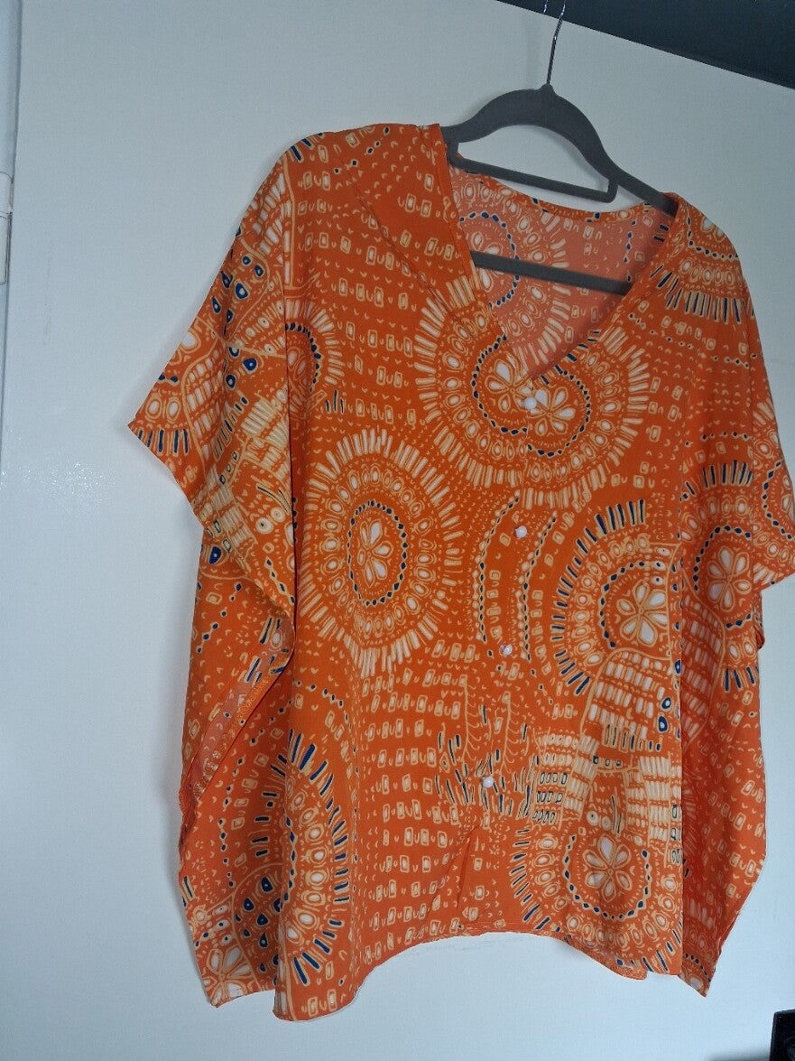 Oranje top met een levendig patroon van cirkels en abstracte vormen in wit en blauw. De top heeft een V-halslijn met sierknoopjes aan de voorkant en korte, wijde mouwen. De pasvorm is los en comfortabel. Maat XXL. 100% polyester