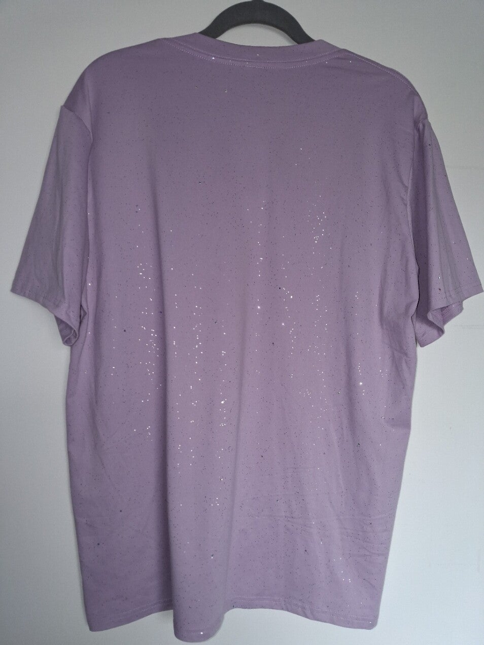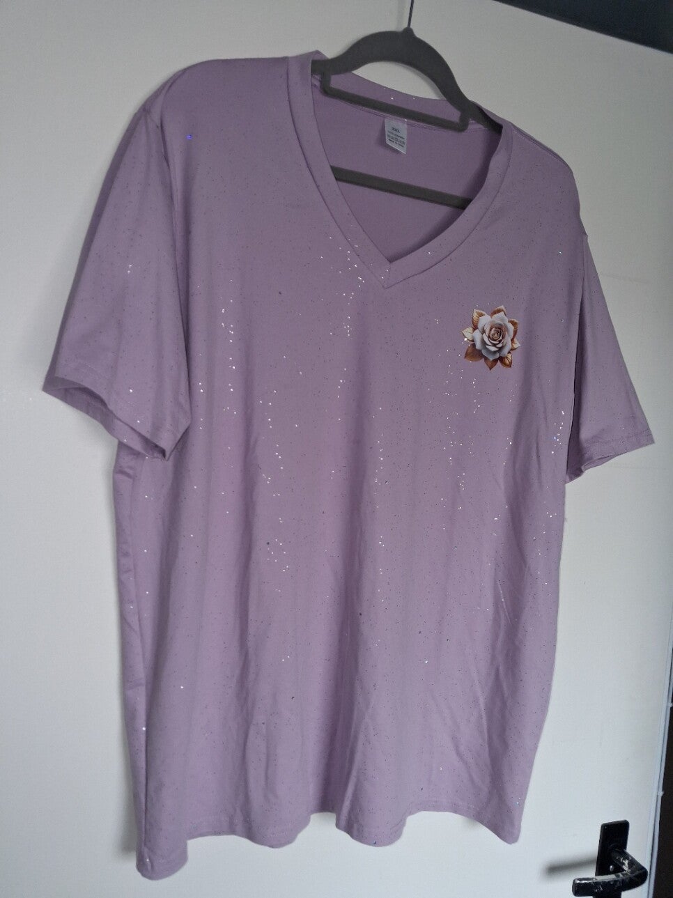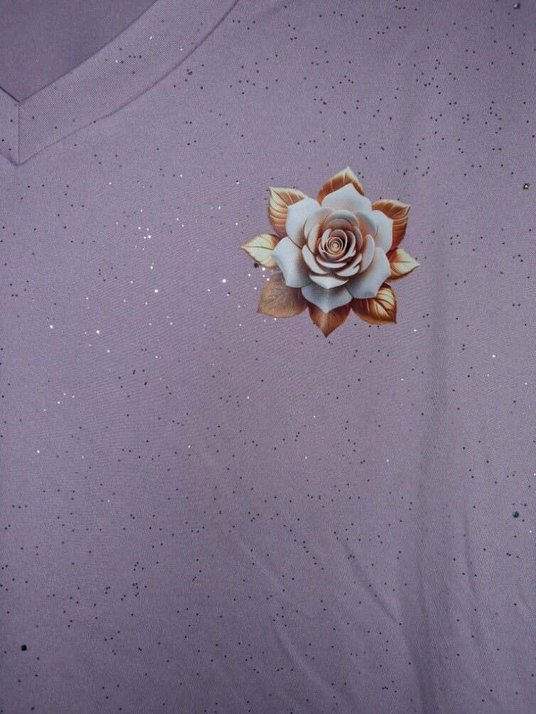 Dit paarse T-shirt met V-hals heeft een opvallende roosapplicatie op de borst en is versierd met subtiele glitterdetails over het hele oppervlak. Het shirt heeft korte mouwen en een rechte zoom. Oksel 59cm lengte 73cm. 100% polyester.