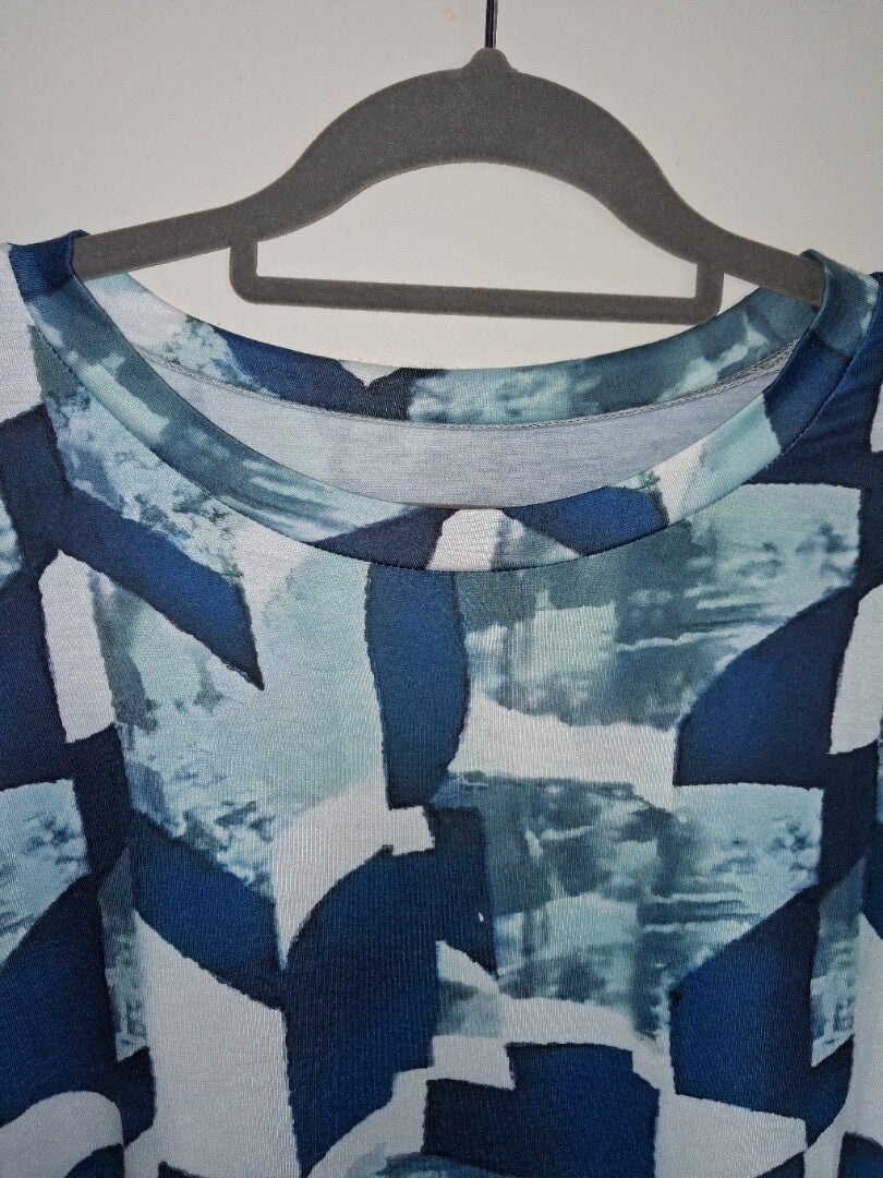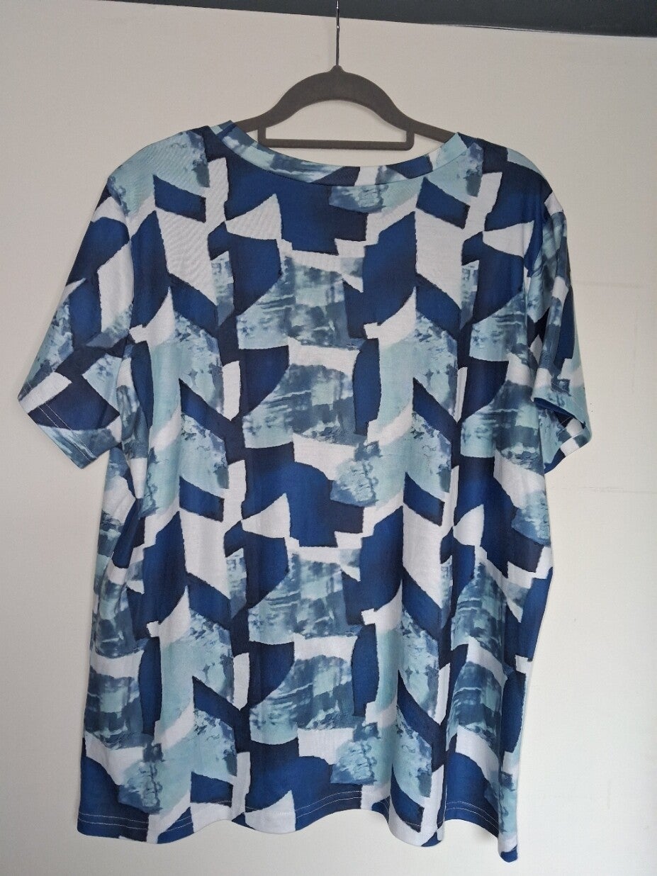 T-shirt met korte mouwen en een ronde hals. Het T-shirt heeft een opvallend patroon in verschillende tinten blauw en wit, wat zorgt voor een dynamische uitstraling. De pasvorm is ruim en comfortabel. Maat XXL. oksel 60cm. lengte 70cm.