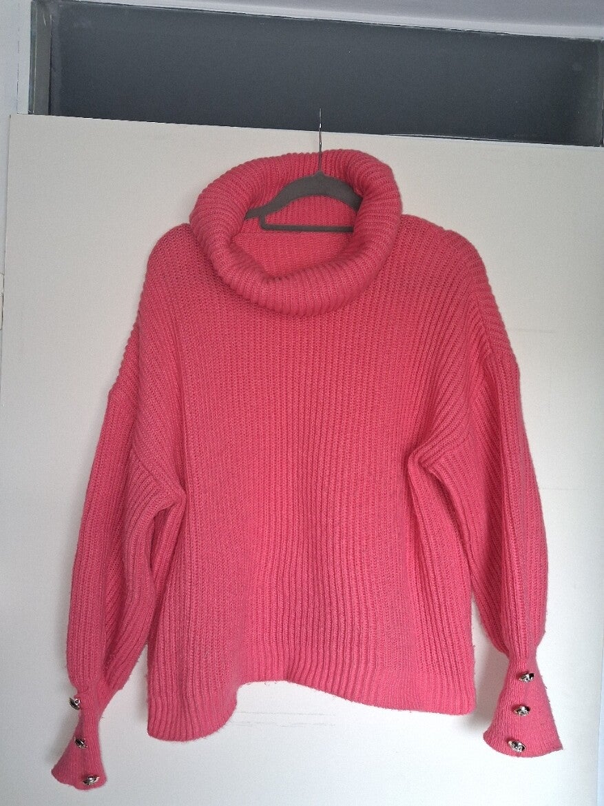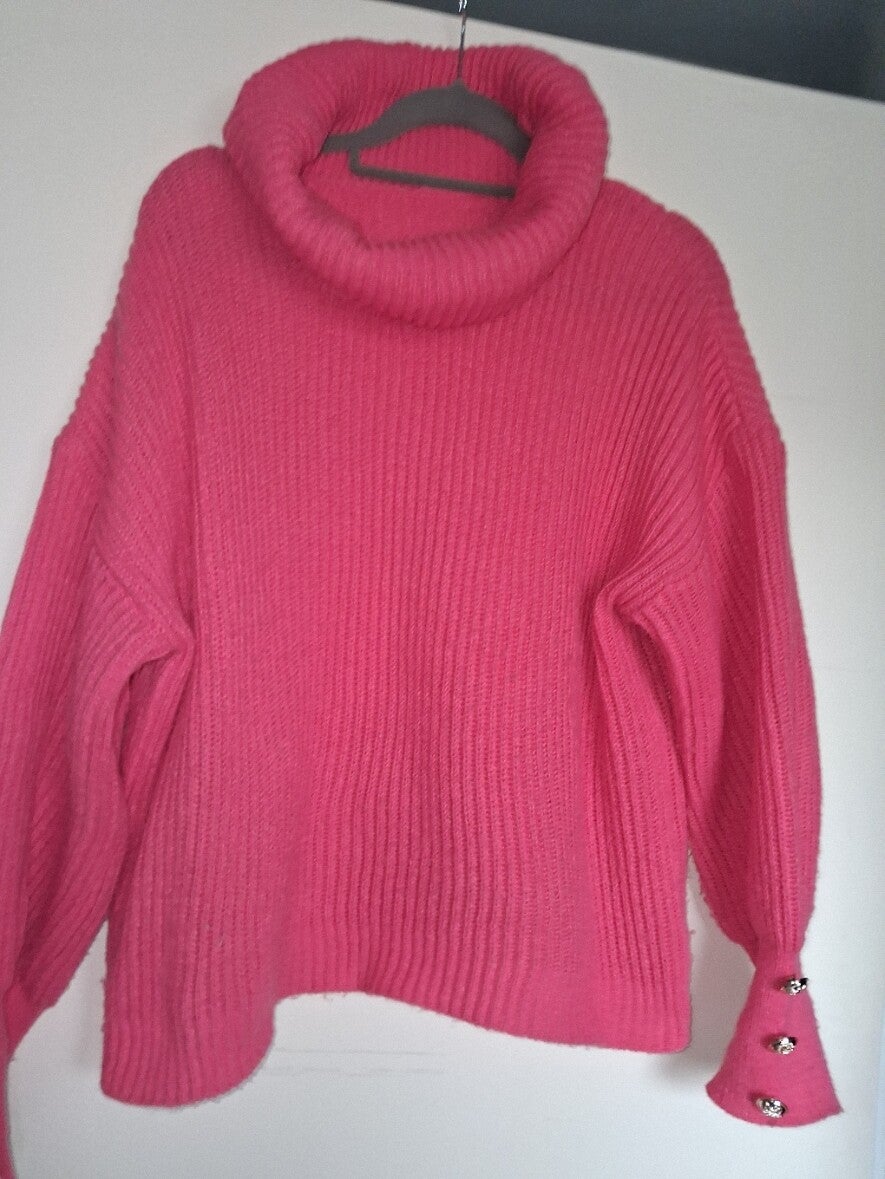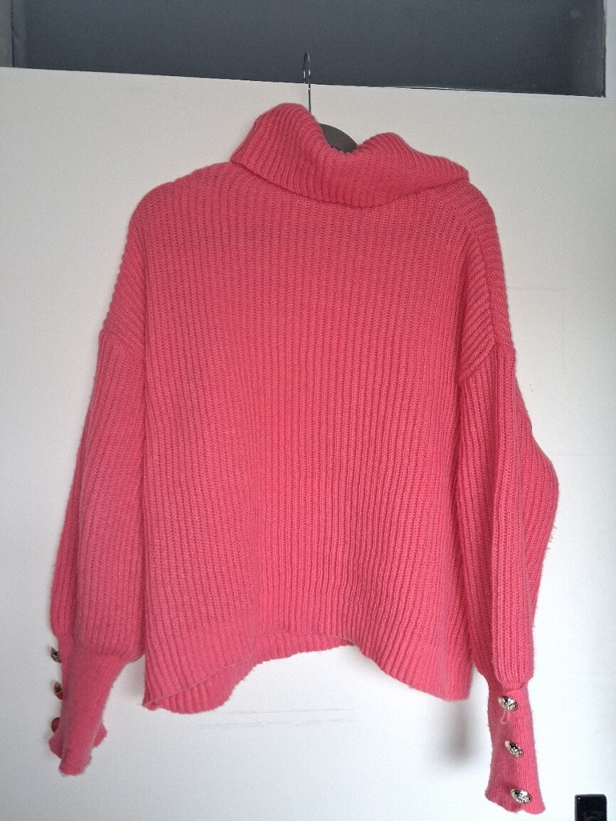 Roze gebreide trui met colkraag. De trui heeft lange mouwen met knoopdetails aan de manchetten. De zoom is asymmetrisch. Maat XL. 100% polyester. oksel 65cm. lengte 55cm.