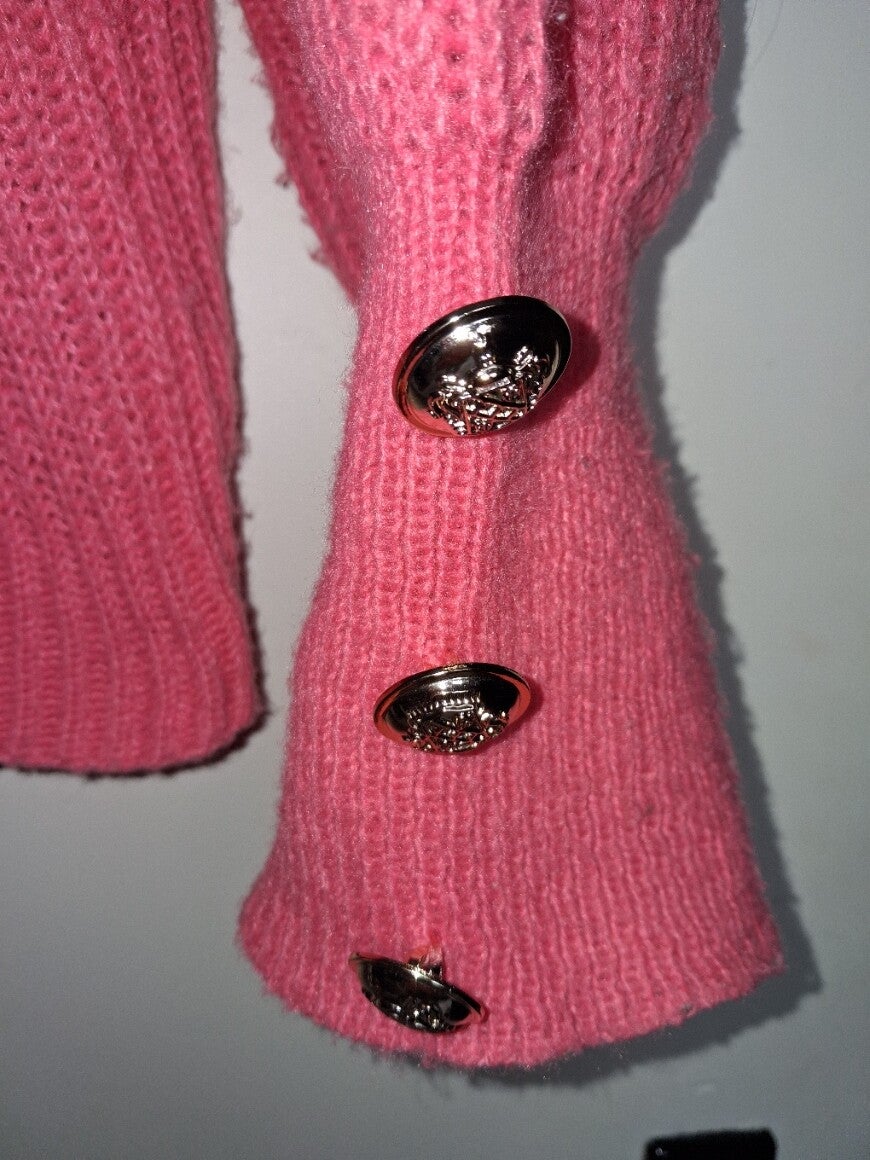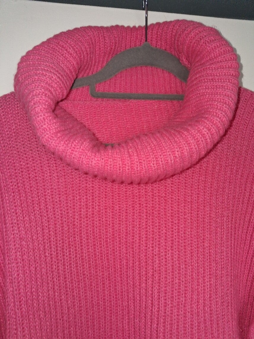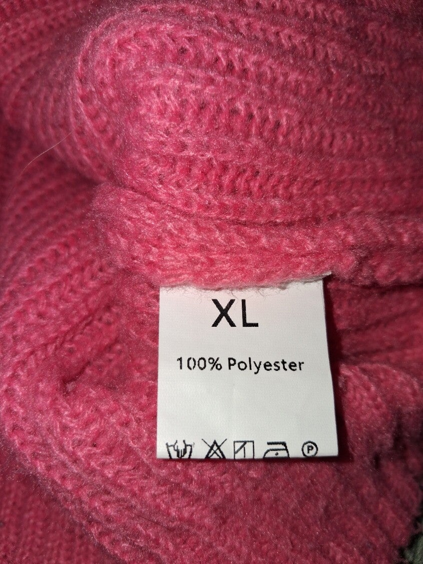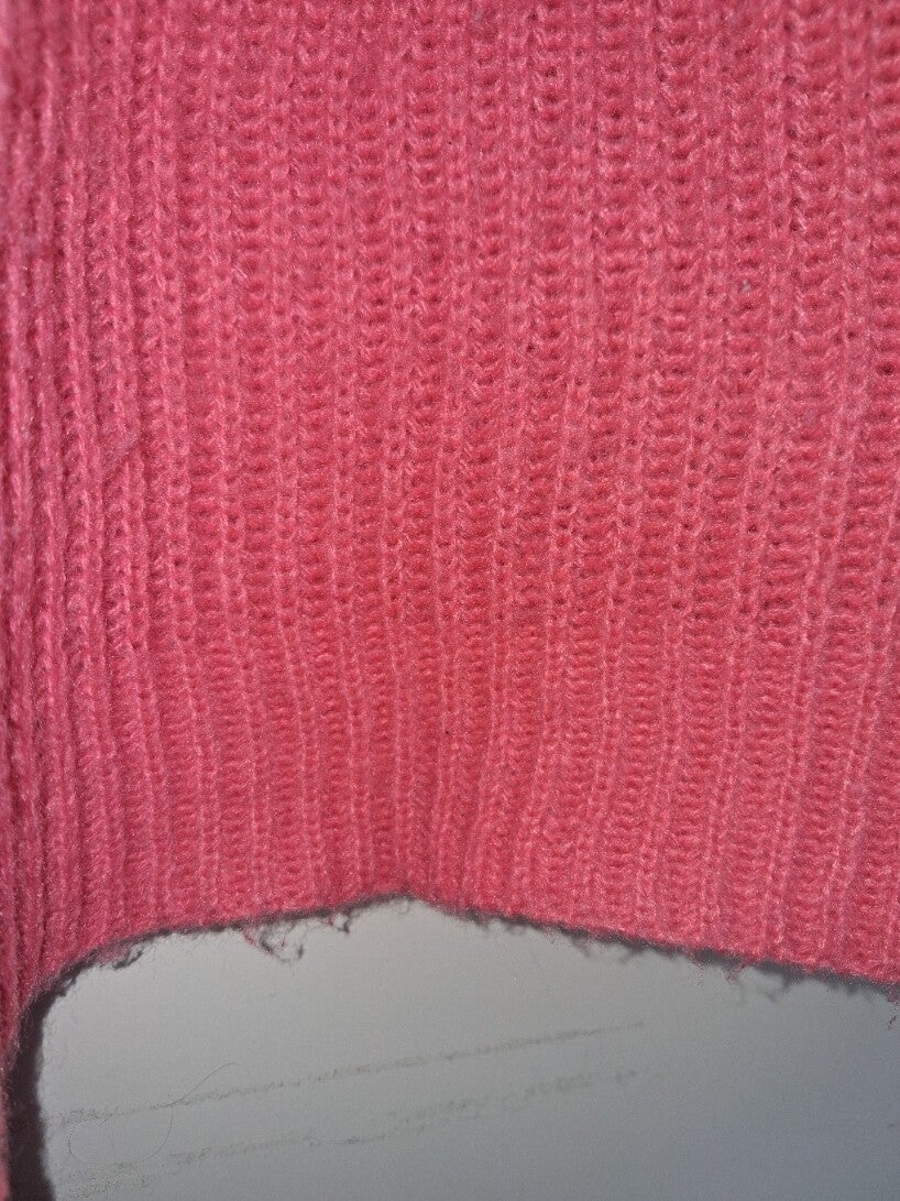 Roze gebreide trui met colkraag. De trui heeft lange mouwen met knoopdetails aan de manchetten. De zoom is asymmetrisch. Maat XL. 100% polyester. oksel 65cm. lengte 55cm.