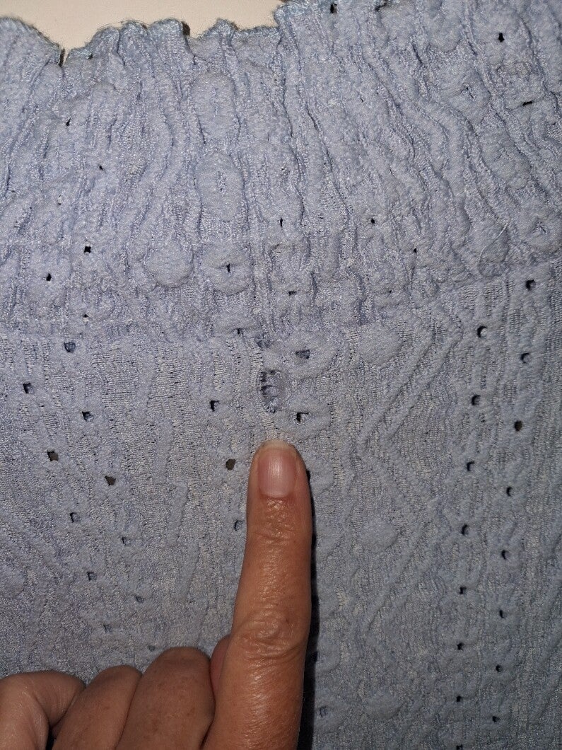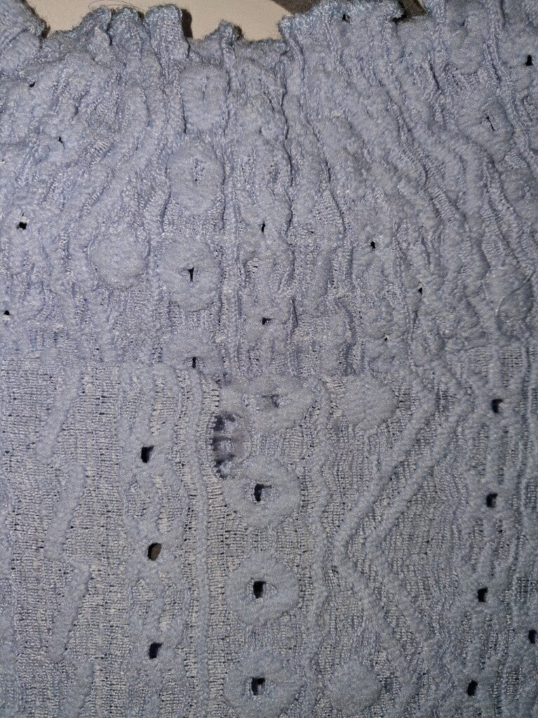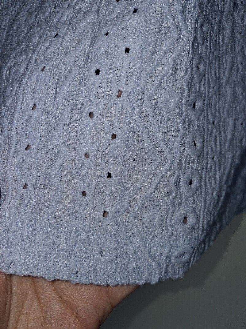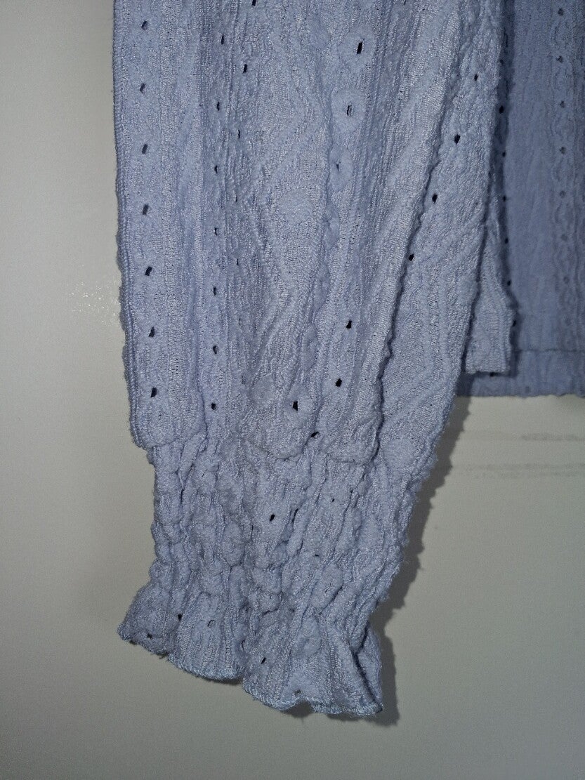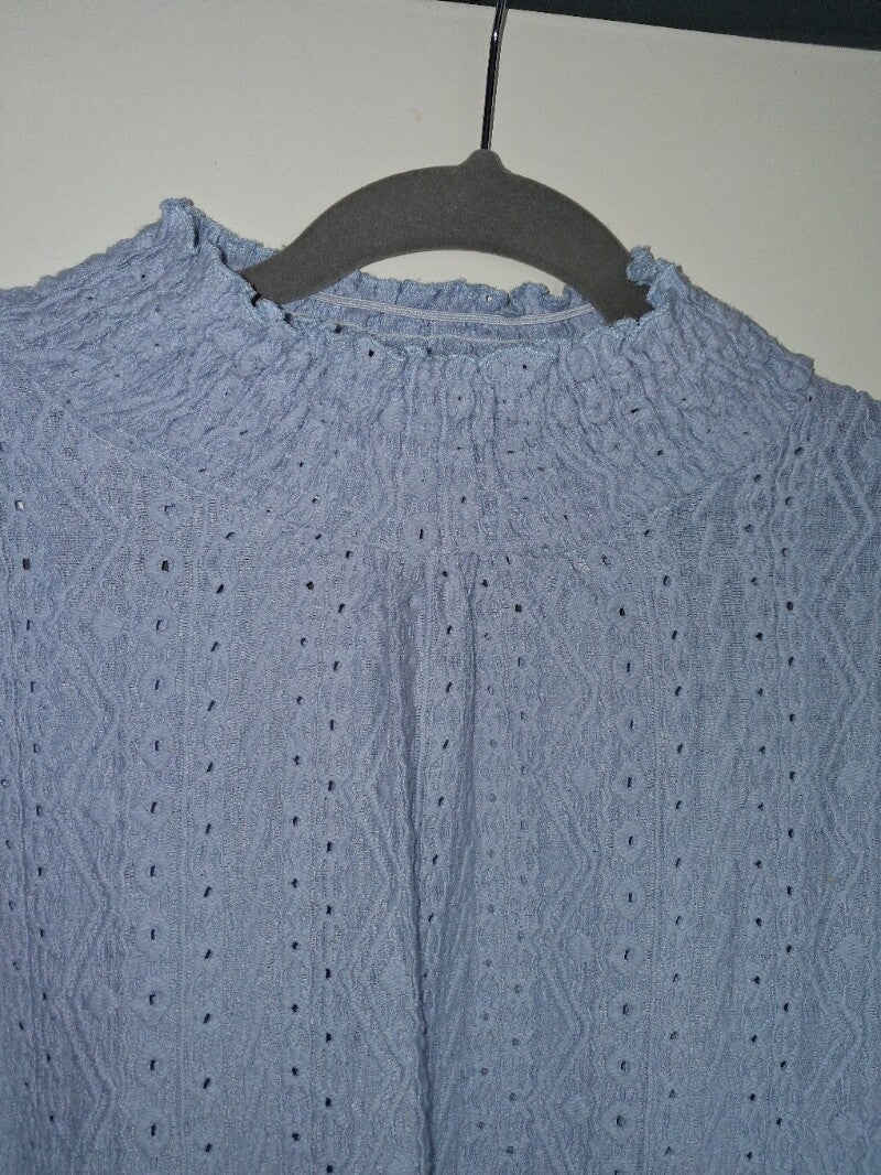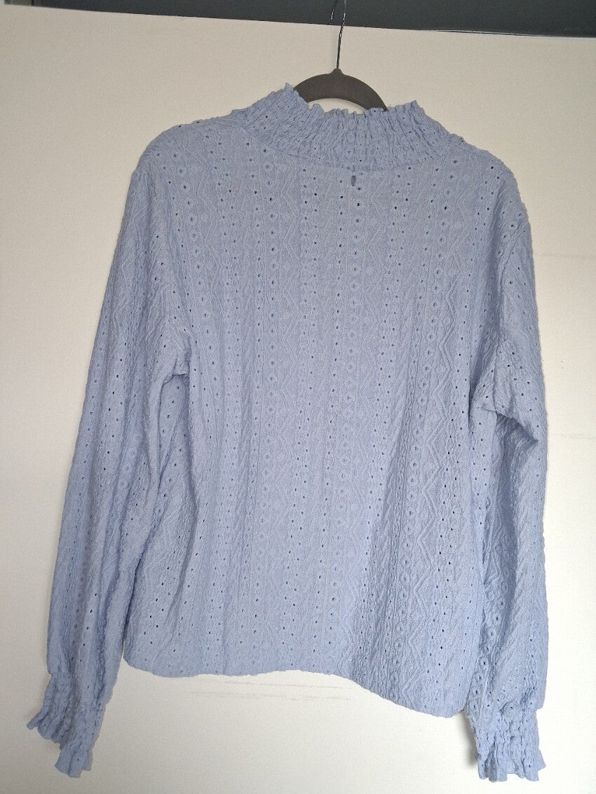 Lichtblauwe blouse met lange mouwen en een opstaande kraag. De blouse heeft een opengewerkt patroon en gesmokte manchetten. ZIt een gaatje in de nek zie foto, verder zo goed als nieuw. Maat XXL