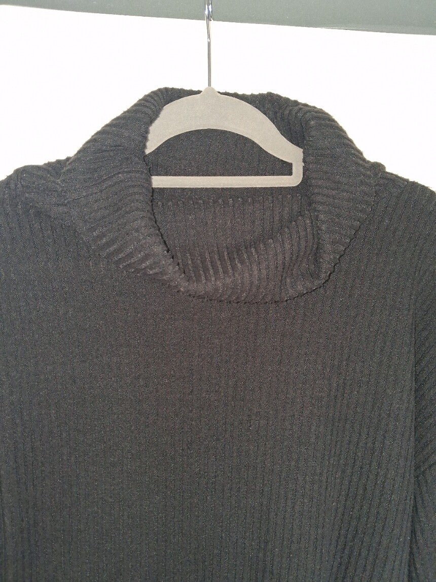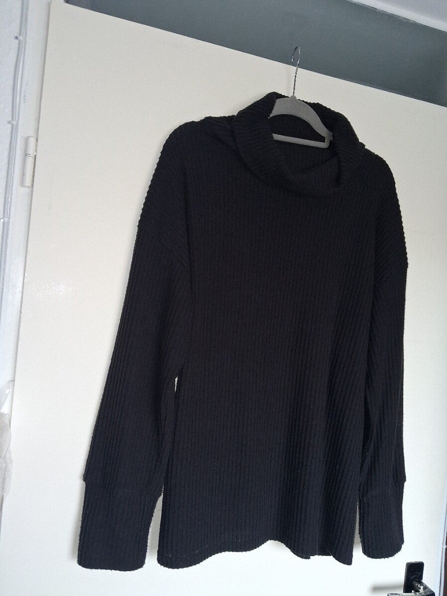 Deze zwarte trui heeft een colkraag en lange mouwen met brede manchetten. De trui heeft een geribbelde textuur en een relaxte pasvorm. De zoom valt recht en de trui is geschikt voor diverse gelegenheden. Maat 2XL.