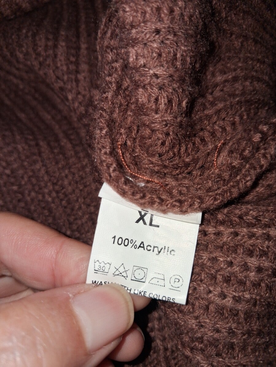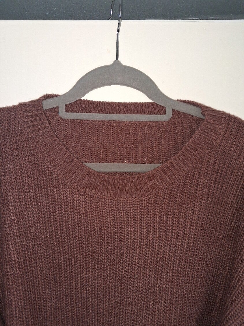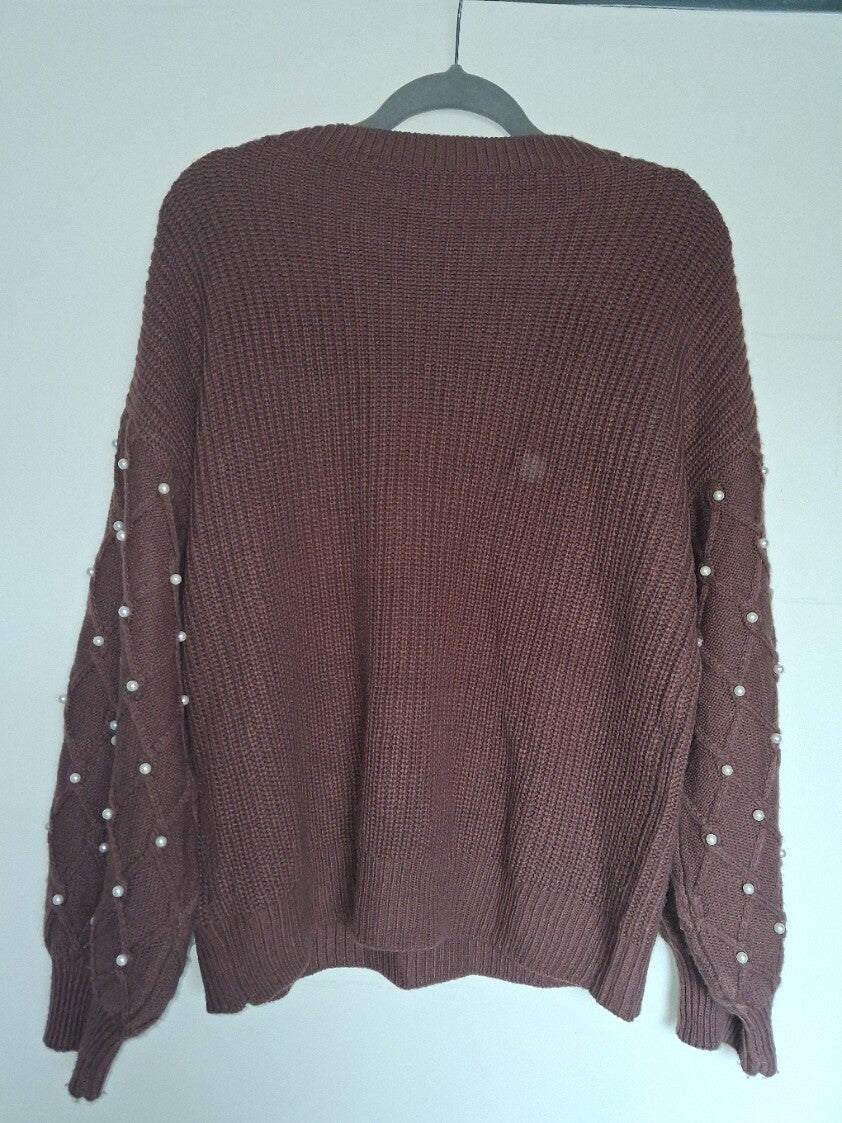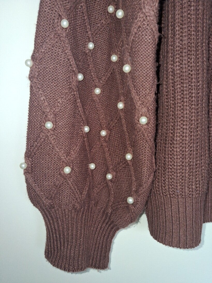 Deze trui heeft een ronde halslijn en lange mouwen. De mouwen zijn versierd met parels in een ruitpatroon, wat een decoratief detail toevoegt aan het ontwerp. De trui heeft een gebreide textuur en een relaxte pasvorm. Maat XL
