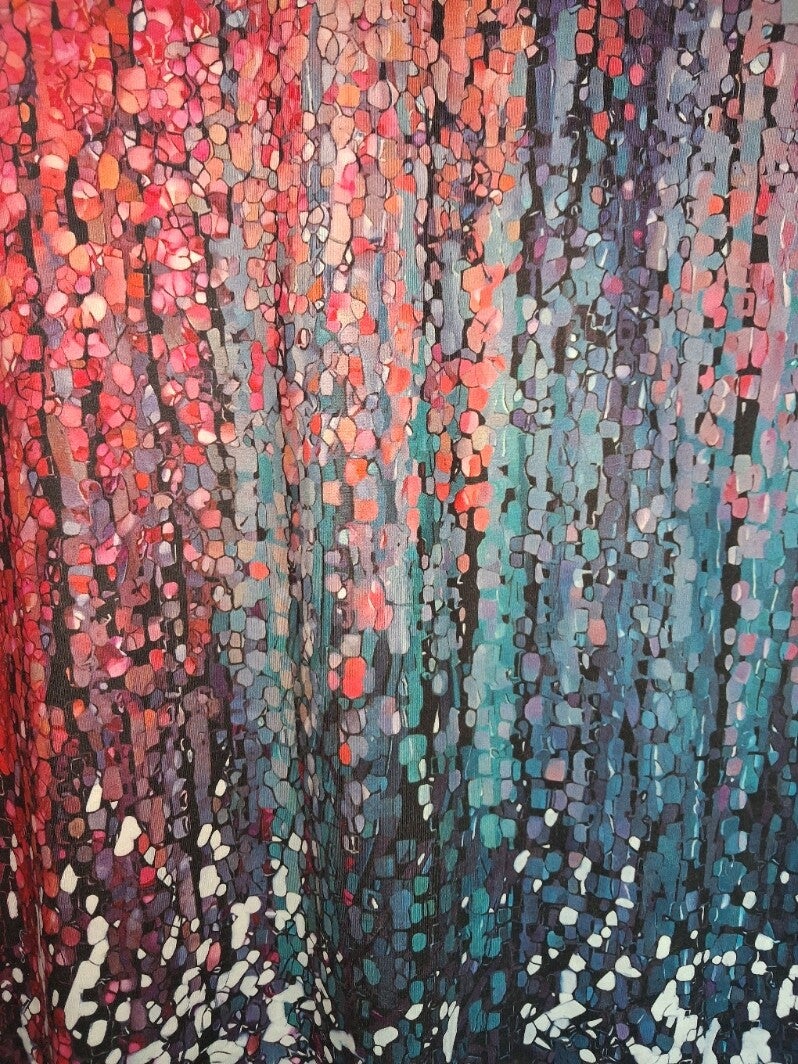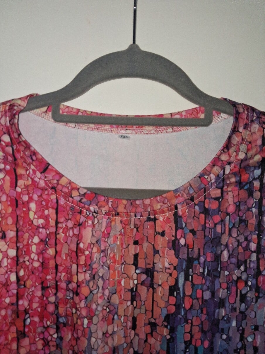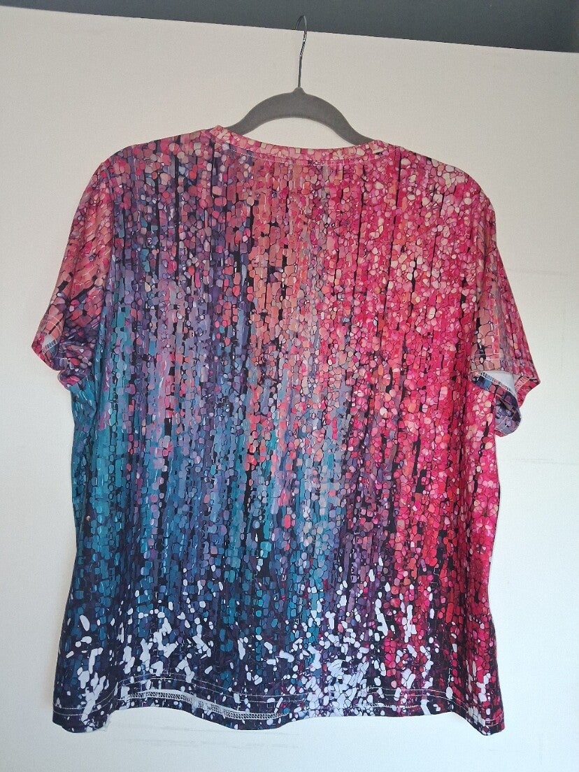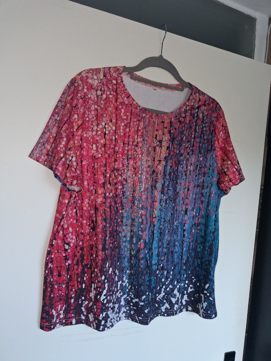 T-shirt met korte mouwen en een ronde hals. Het shirt heeft een opvallend patroon met een kleurverloop van roze en rood naar blauw en paars, met een spikkelachtig effect dat doet denken aan verfspatten. De onderkant van het shirt heeft een lichtere spikkelprint. Maat XXL.