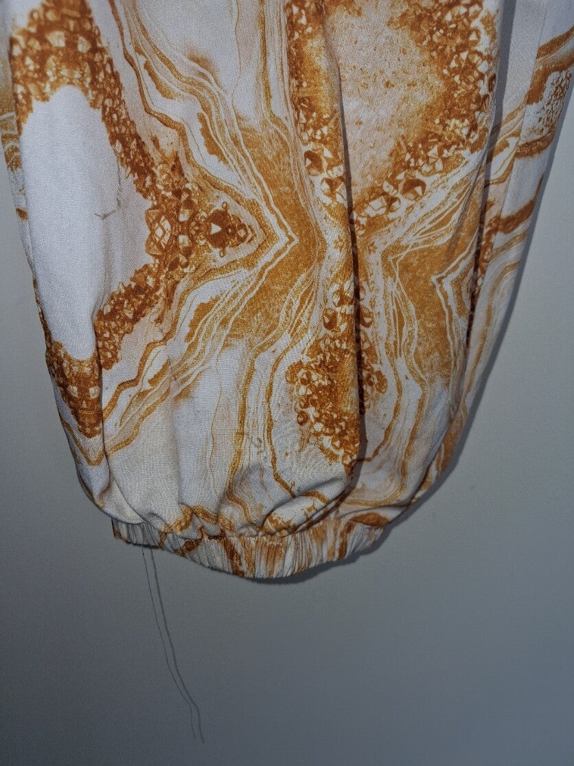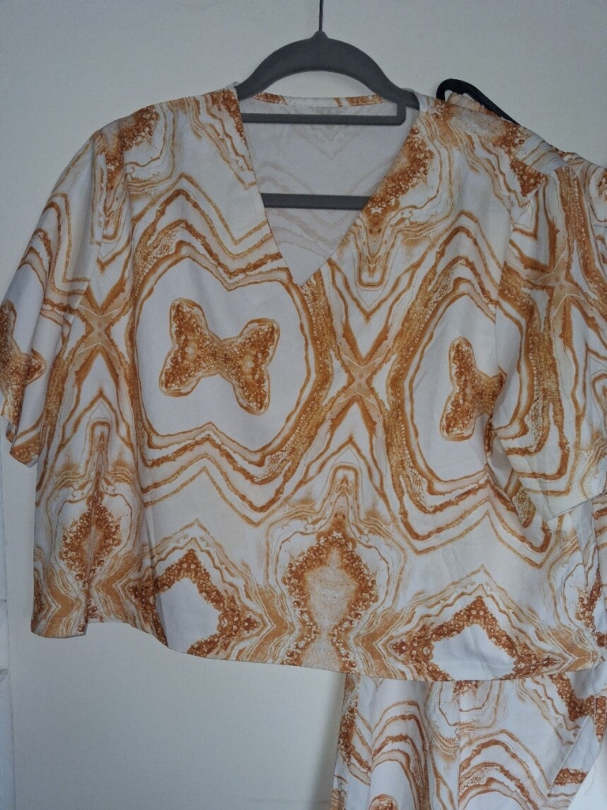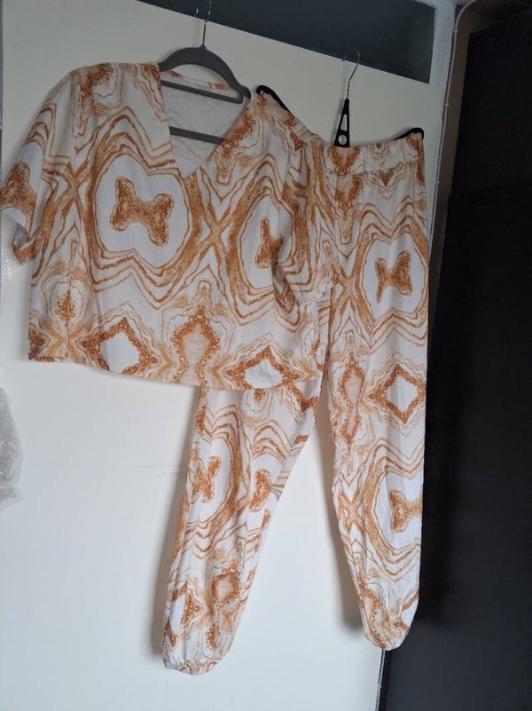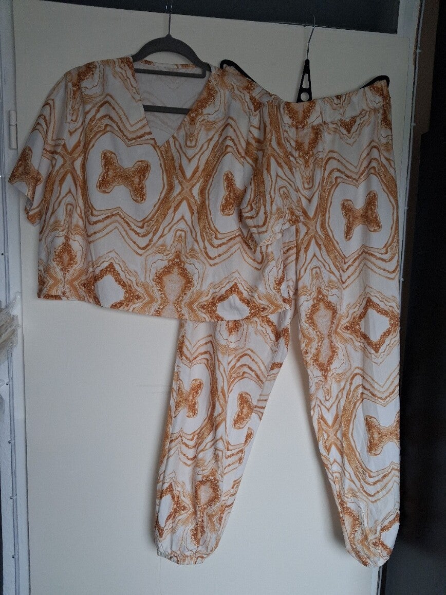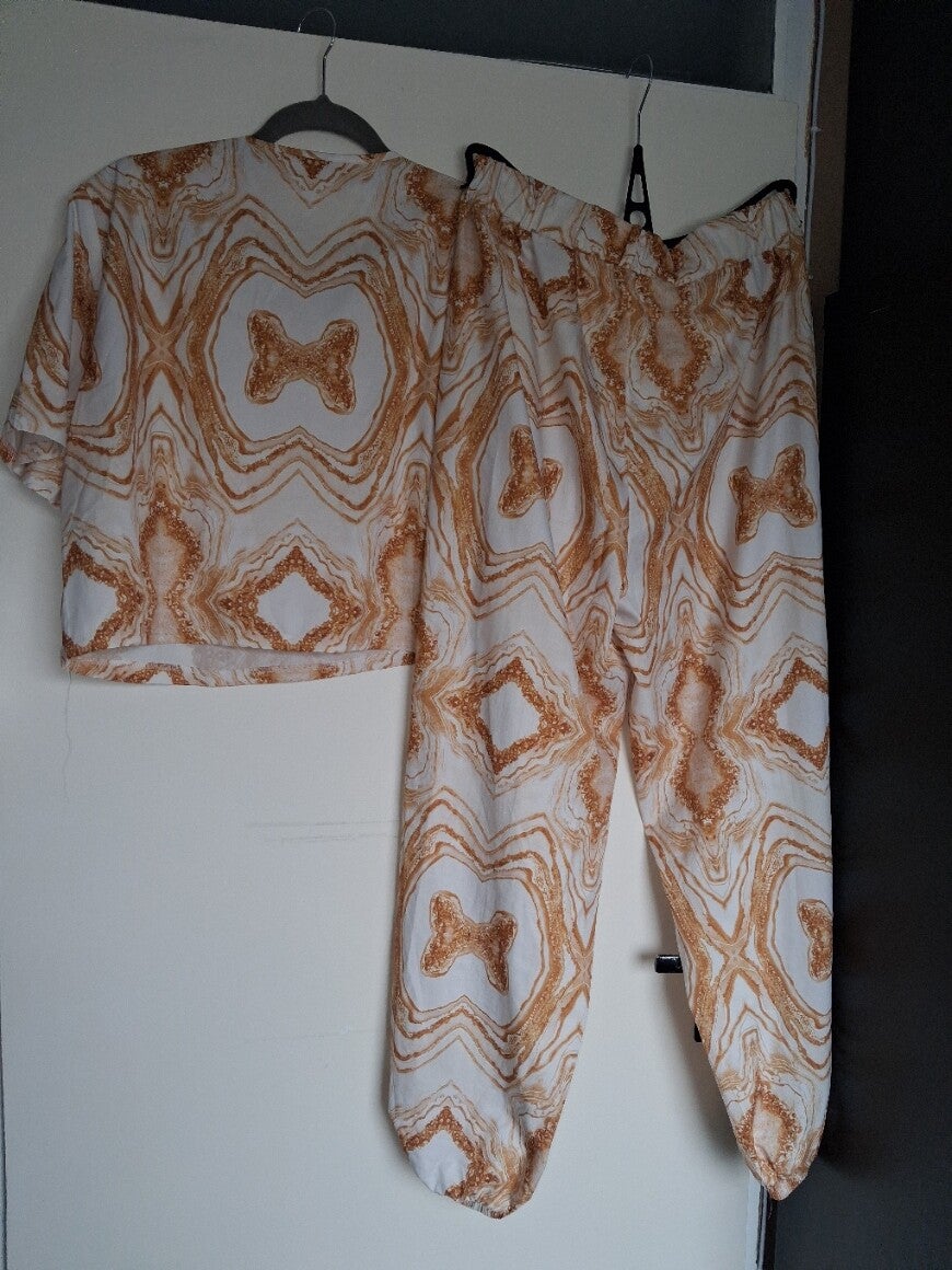 Deze tweedelige set bestaat uit een top met korte mouwen en een V-hals, en een bijpassende broek. De set heeft een opvallend patroon in wit en bruin/goudtinten. De broek heeft elastische manchetten aan de onderkant van de pijpen. Maat XXL.
