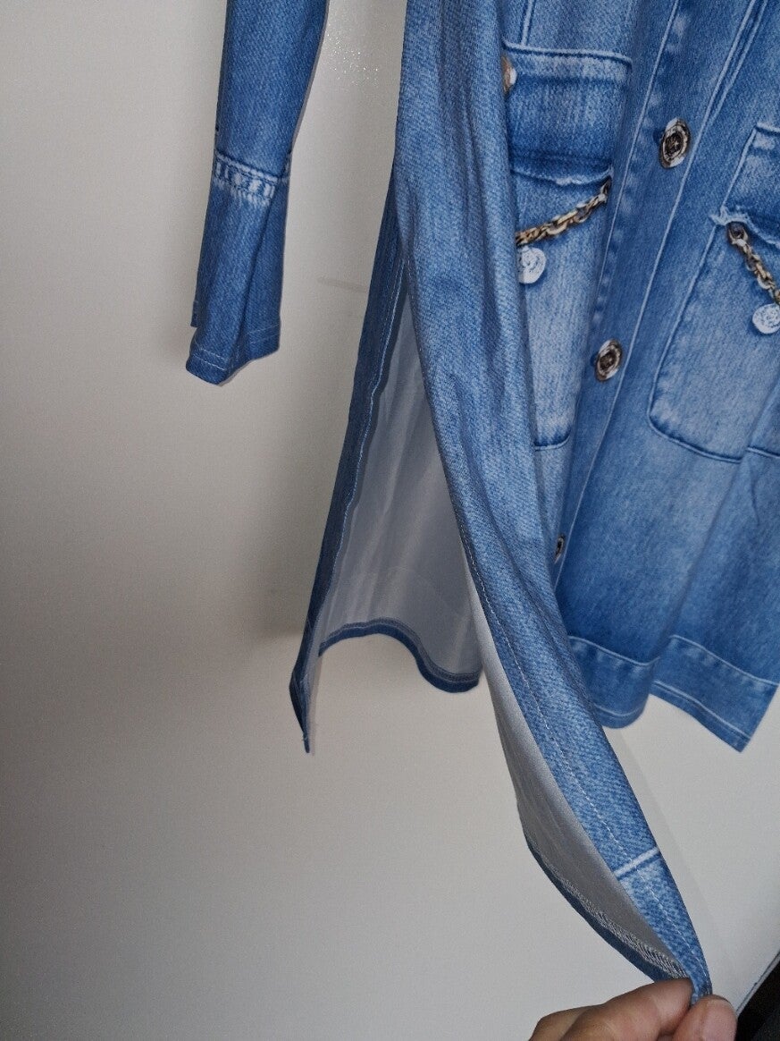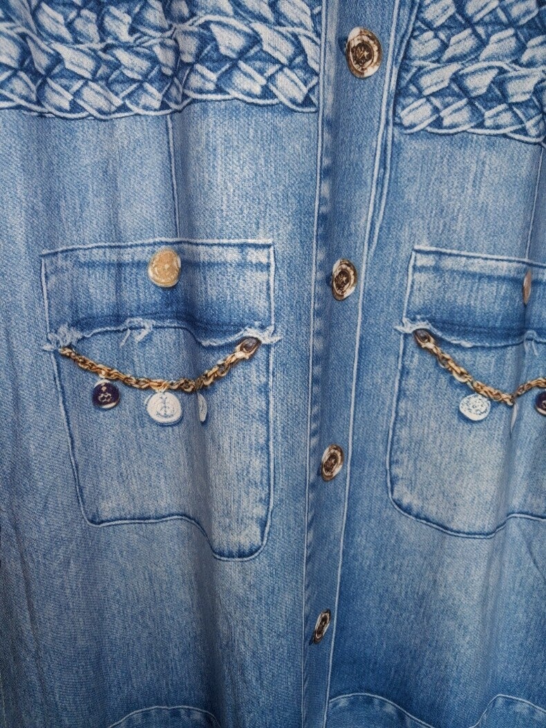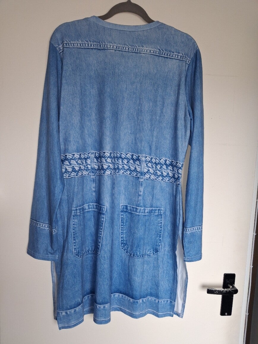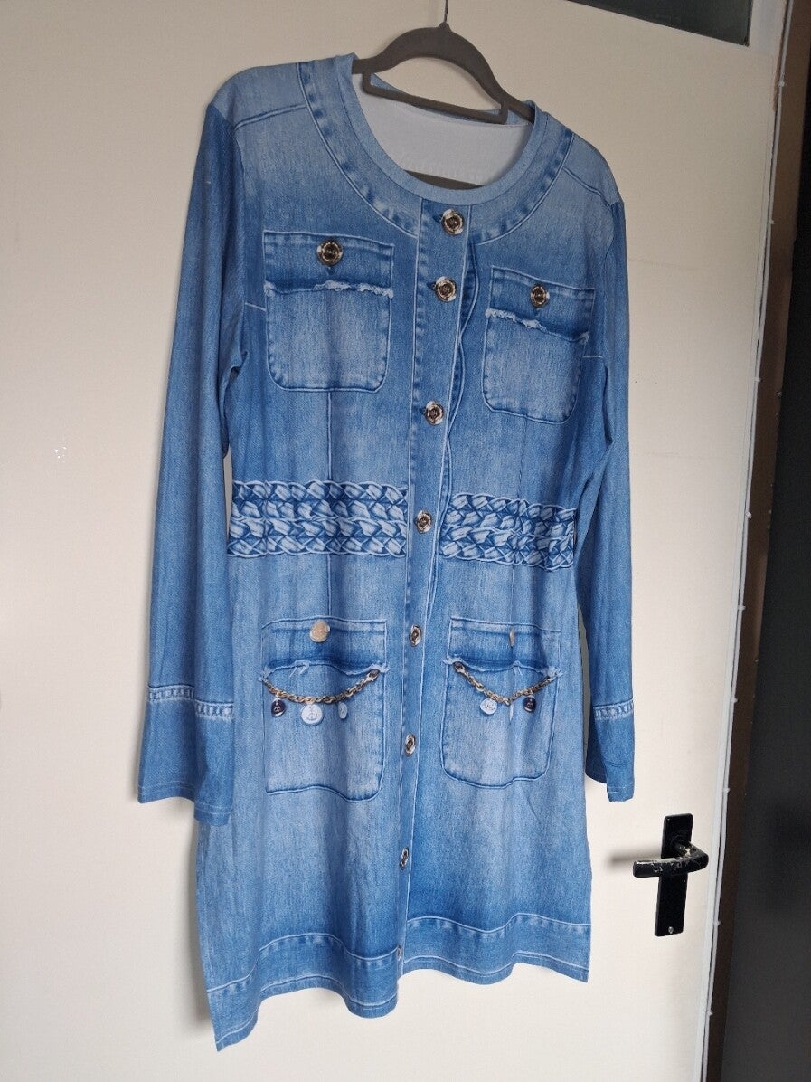 Deze jurk heeft een denimlook met lange mouwen en een ronde hals. De voorkant is voorzien van bedrukte knoopdetails en bedrukte zakken met ketting- en bedelversieringen. Er is een decoratieve band met een gevlochten patroon rond de taille. De jurk heeft zijsplitten voor bewegingsvrijheid en de achterkant heeft ook opgestikte zakken. Maat XXL.