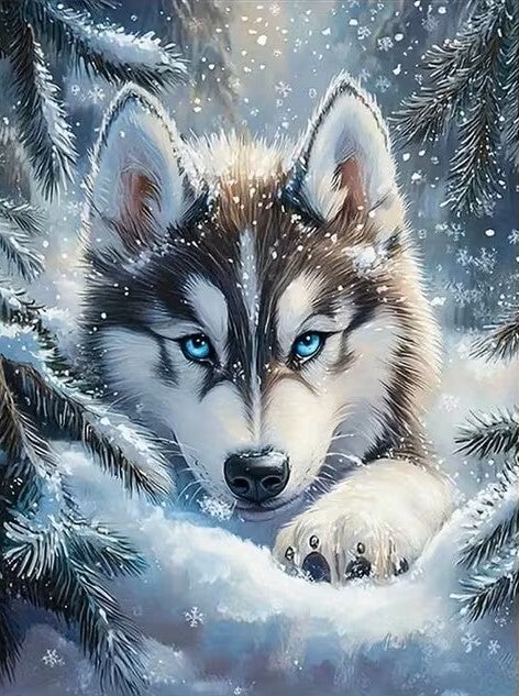 nr 125 Diamond Painting wolf blauwe ogen 50x40cm (rond)